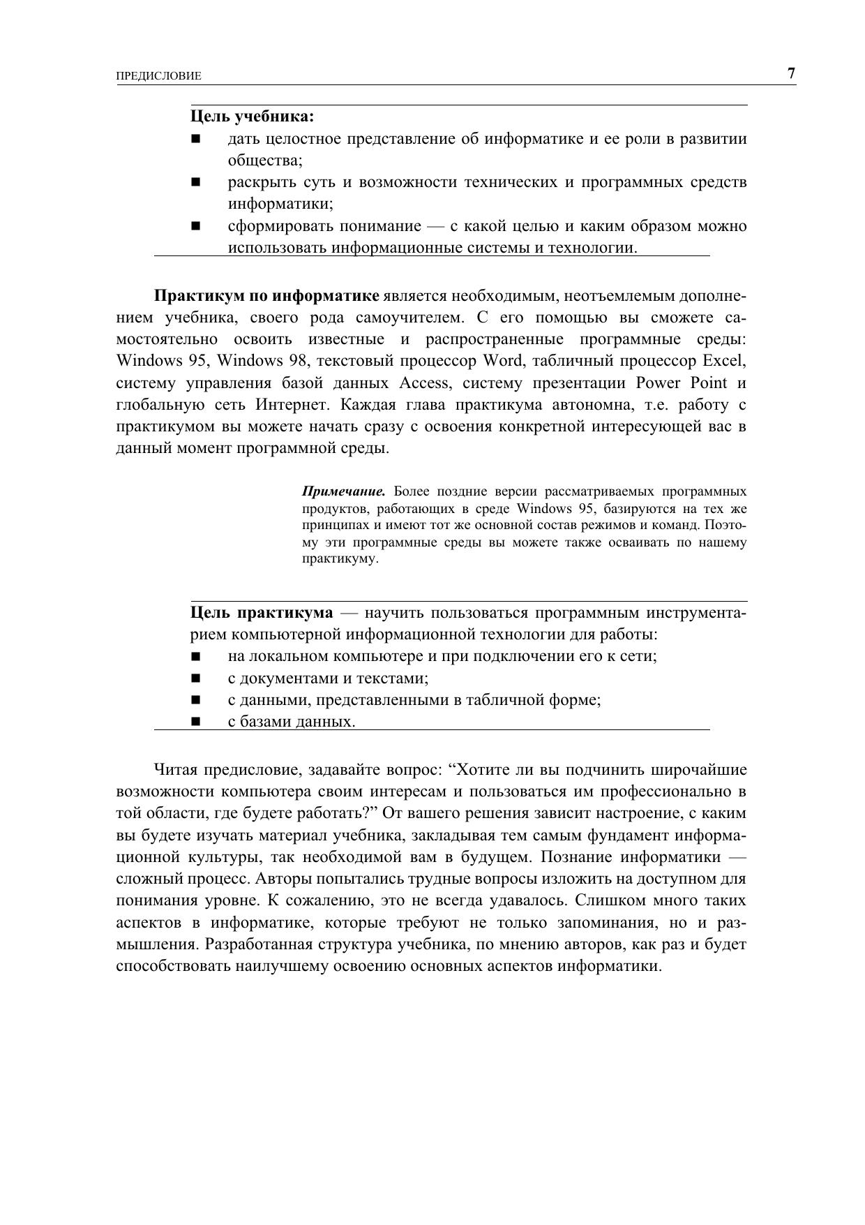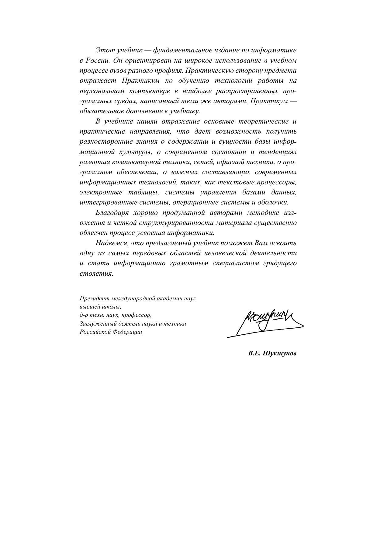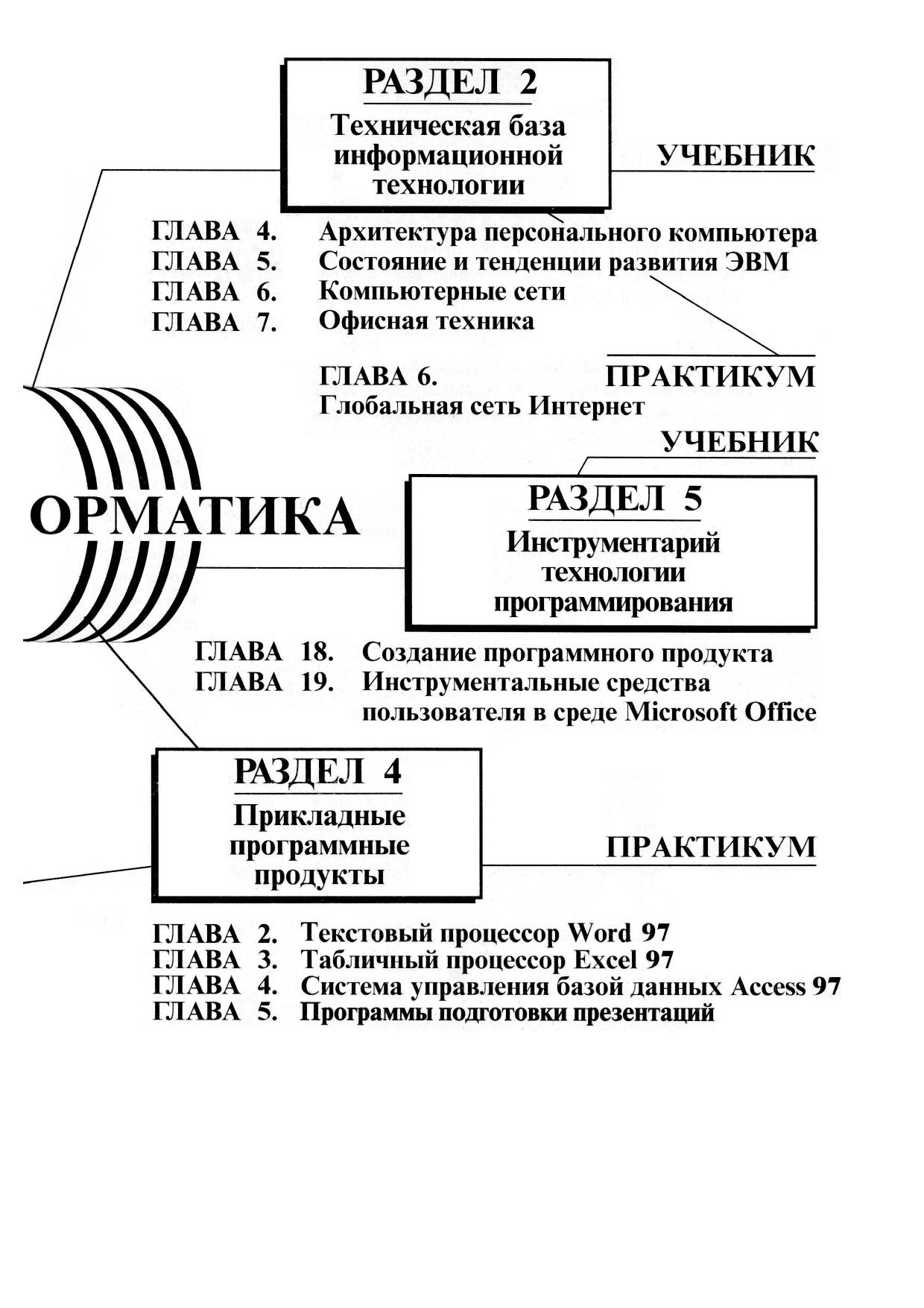 Рассмотрены разделы информатики, определяющие базовый уровень подготовки специалистов: основы информационной культуры, современные технические средства и программный инструментарий новых информационных технологий (системное и прикладное программное обеспечение, инструментарий создания программных продуктов). Для студентов, изучающих дисциплину «Информатика», преподавателей, слушателей институтов повышения квалификации; может быть использован широким кругом пользователей персонального компьютера.