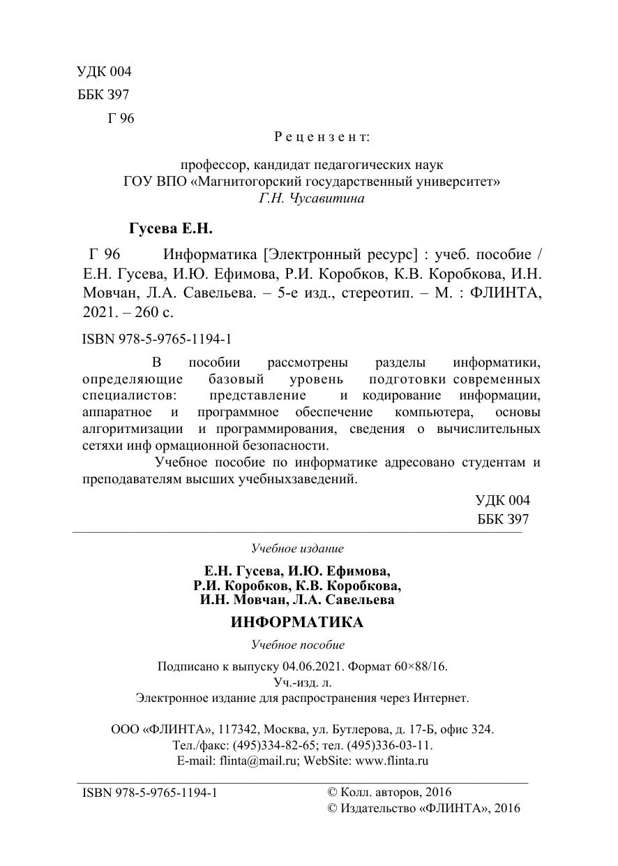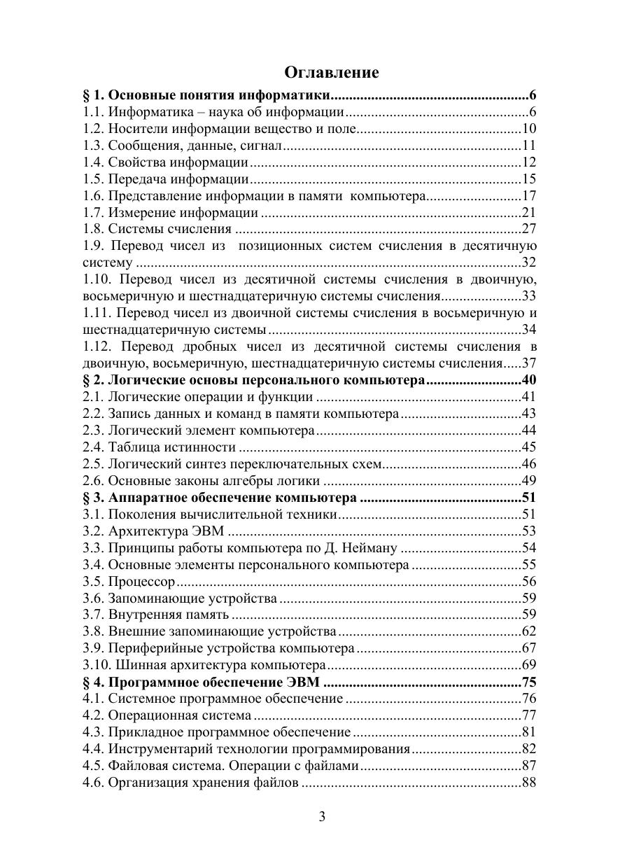 В пособии рассмотрены разделы информатики, определяющие базовый уровень подготовки современных специалистов: представление и кодирование информации, аппаратное и программное обеспечение компьютера, основы алгоритмизации и программирования, сведения о вычислительных сетях и информационной безопасности.