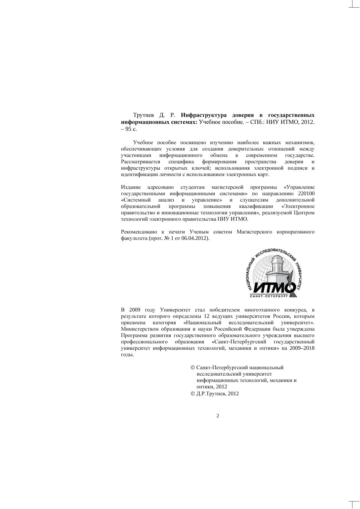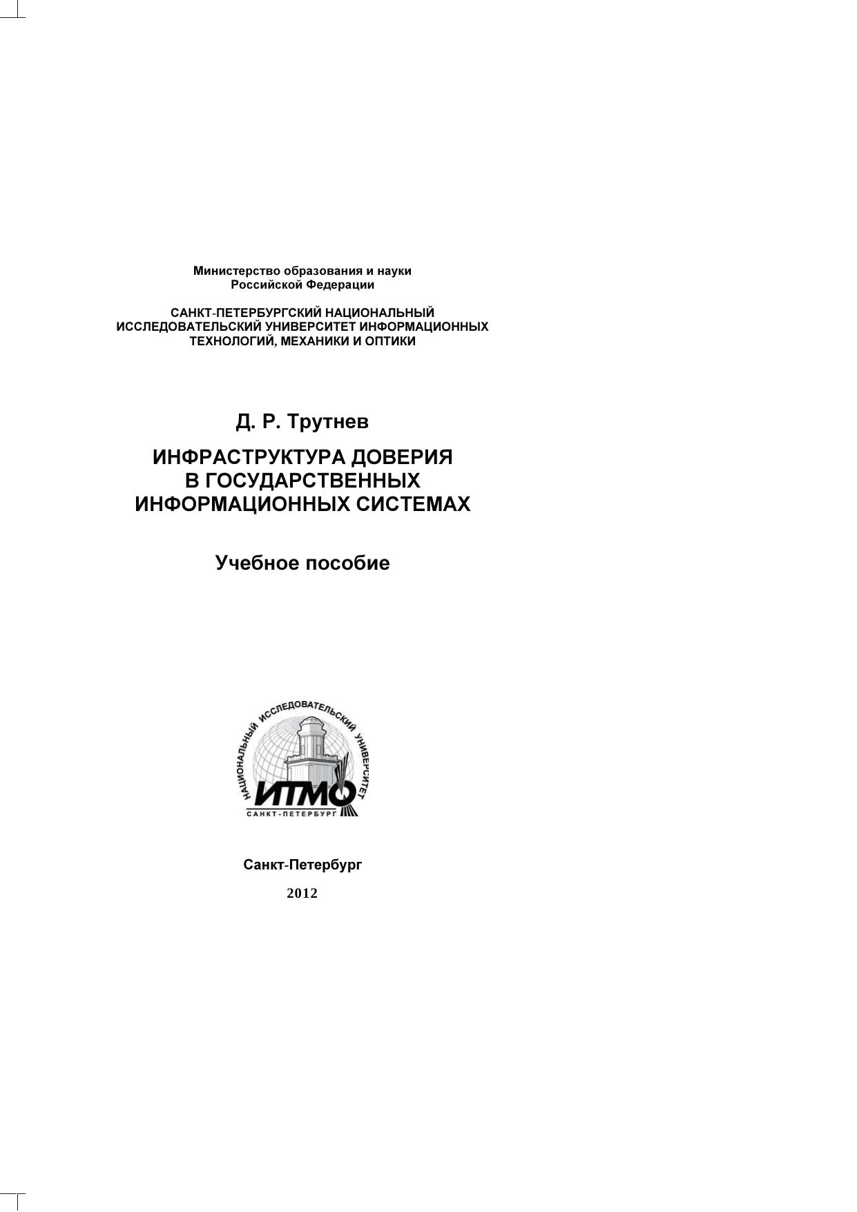 Учебное пособие посвящено изучению наиболее важных механизмов, обеспечивающих условия для создания доверительных отношений между участниками информационного обмена в современном государстве. Рассматривается специфика формирования пространства доверия и инфраструктуры открытых ключей использования электронной подписи и идентификации личности с использованием электронных карт. Издание адресовано студентам магистерской программы «Управление государственными информационными системами» по направлению 220100 «Системный анализ и управление» и слушателям дополнительной образовательной программы повышения квалификации «Электронное правительство и инновационные технологии управления», реализуемой Центром технологий электронного правительства НИУ ИТМО.