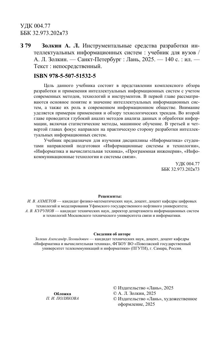 Цель данного учебника состоит в представлении комплексного обзора разработки и применения интеллектуальных информационных систем с учетом современных методов, технологий и инструментов. В первой главе рассматриваются основное понятие и значение интеллектуальных информационных систем, а также их роль в современном информационном обществе. Внимание уделяется примерам применения и обзору технологических трендов. Во второй главе проводится глубокий анализ методов анализа данных и обработки информации, включая статистические методы, машинное обучение. В третьей и четвертой главах фокус направлен на практическую сторону разработки интеллектуальных информационных систем. Учебник предназначен для изучения дисциплины «Информатика» студентами направлений подготовки «Информационные системы и технологии», «Информатика и вычислительная техника», «Программная инженерия», «Инфокоммуникационные технологии и системы связи».
