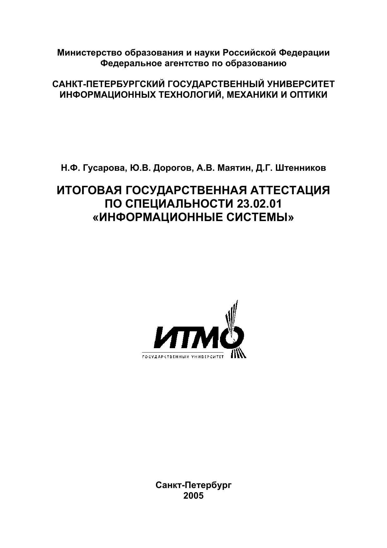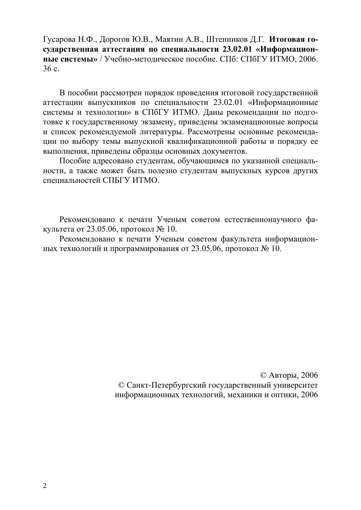 В пособии рассмотрен порядок проведения итоговой государственной аттестации выпускников по специальности 23.02.01 «Информационные системы и технологии» в СПбГУ ИТМО. Даны рекомендации по подготовке к государственному экзамену, приведены экзаменационные вопросы и список рекомендуемой литературы. Рассмотрены основные рекомендации по выбору темы выпускной квалификационной работы и порядку ее выполнения, приведены образцы основных документов.Пособие адресовано студентам, обучающимся по указанной специальности, а также может быть полезно студентам выпускных курсов других специальностей СПБГУ ИТМО.