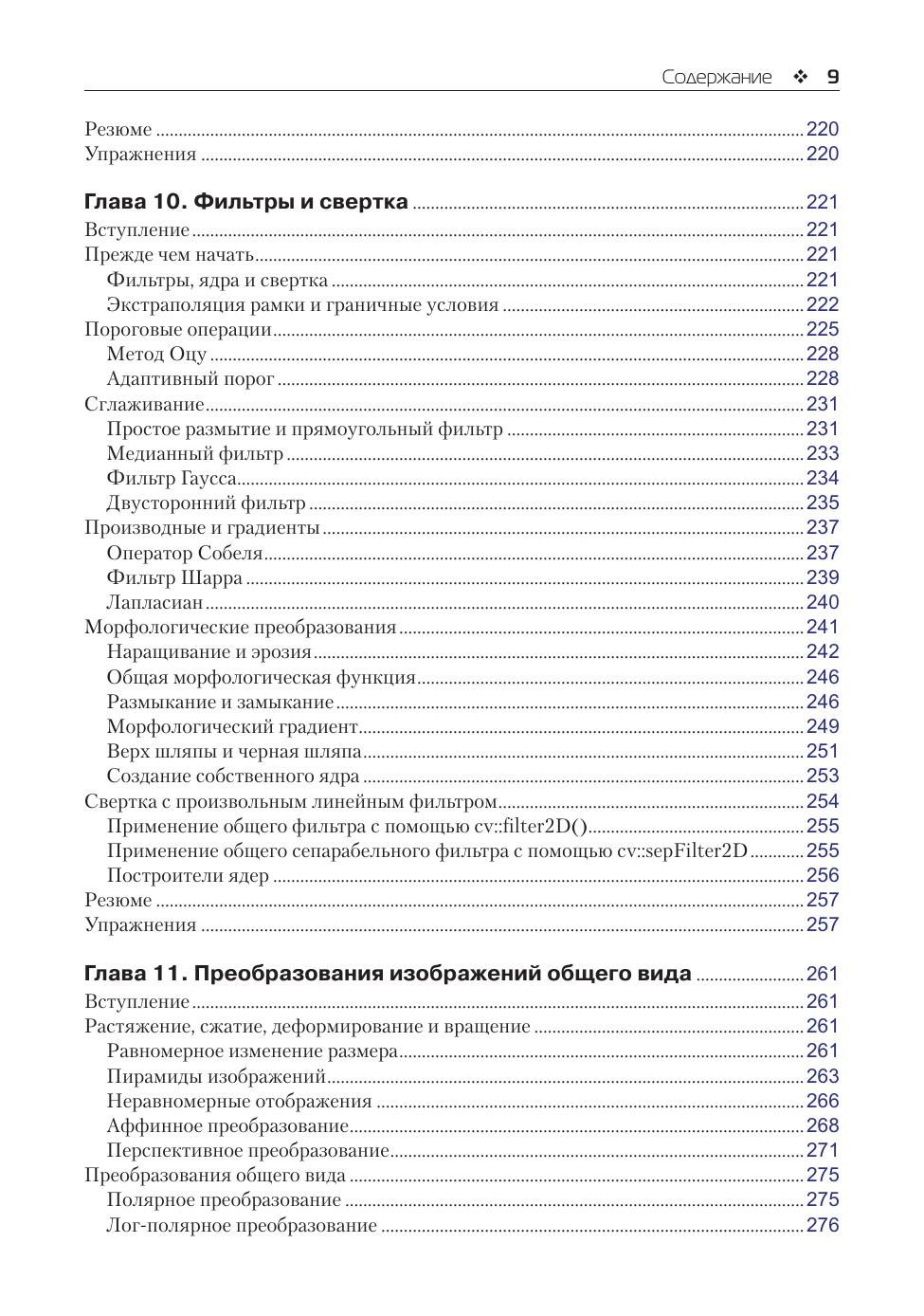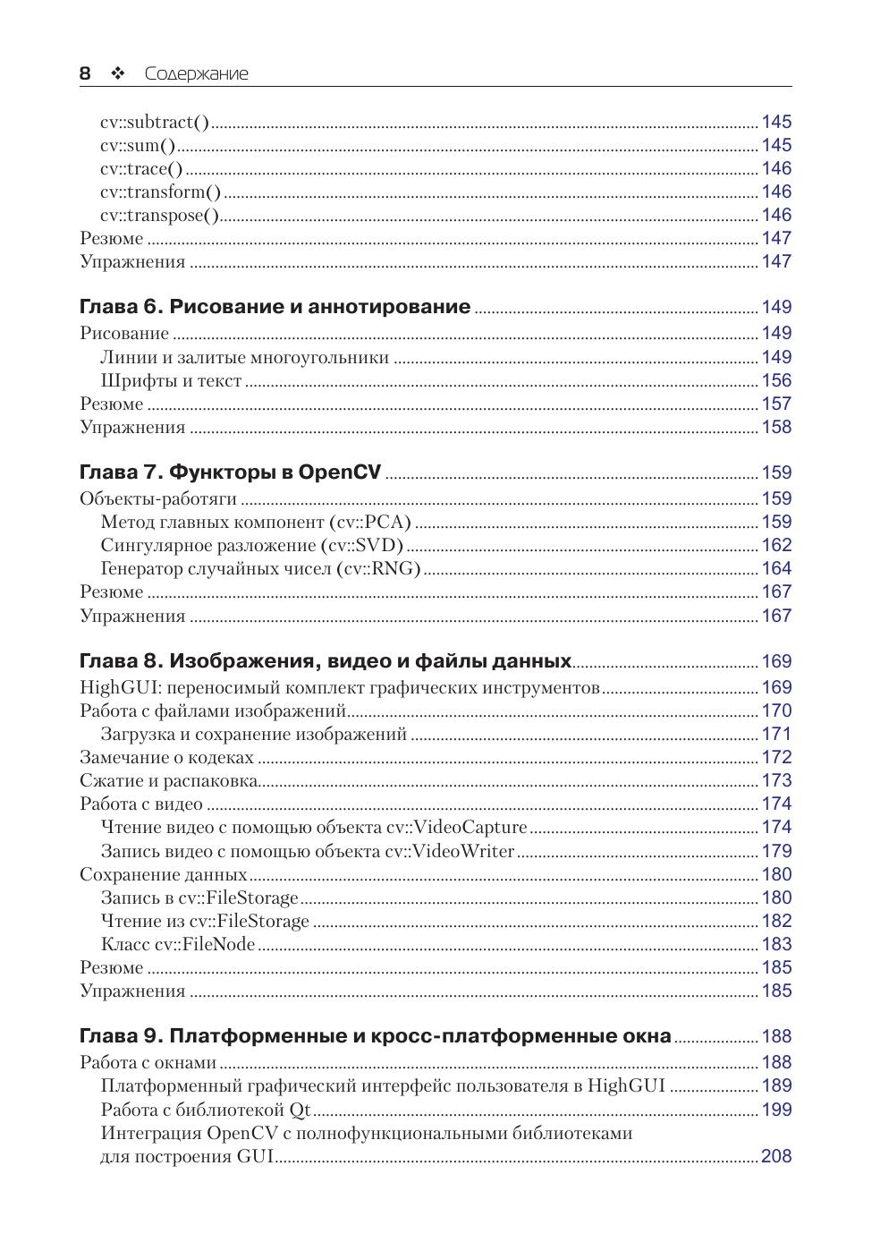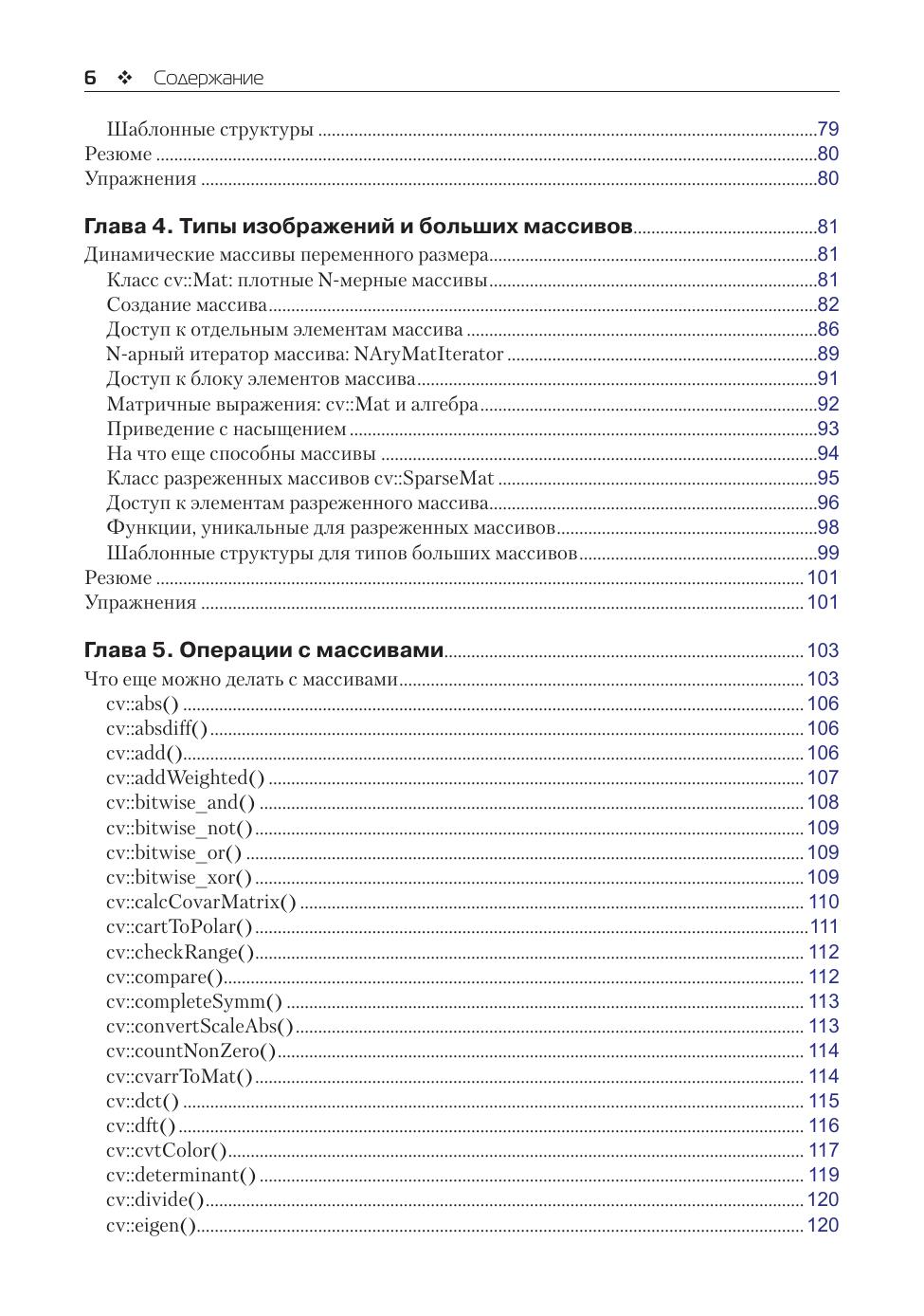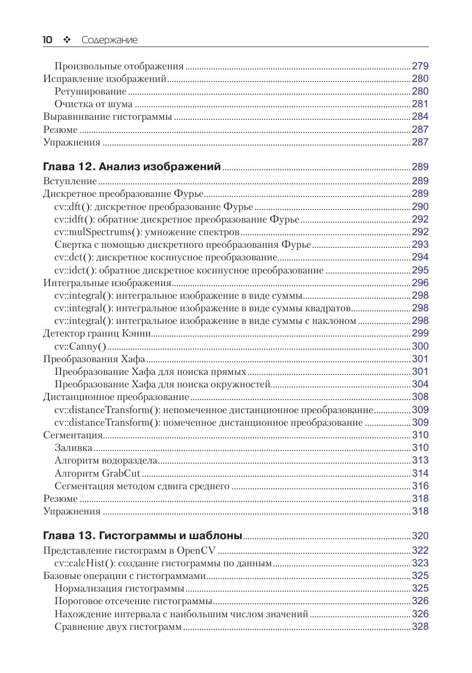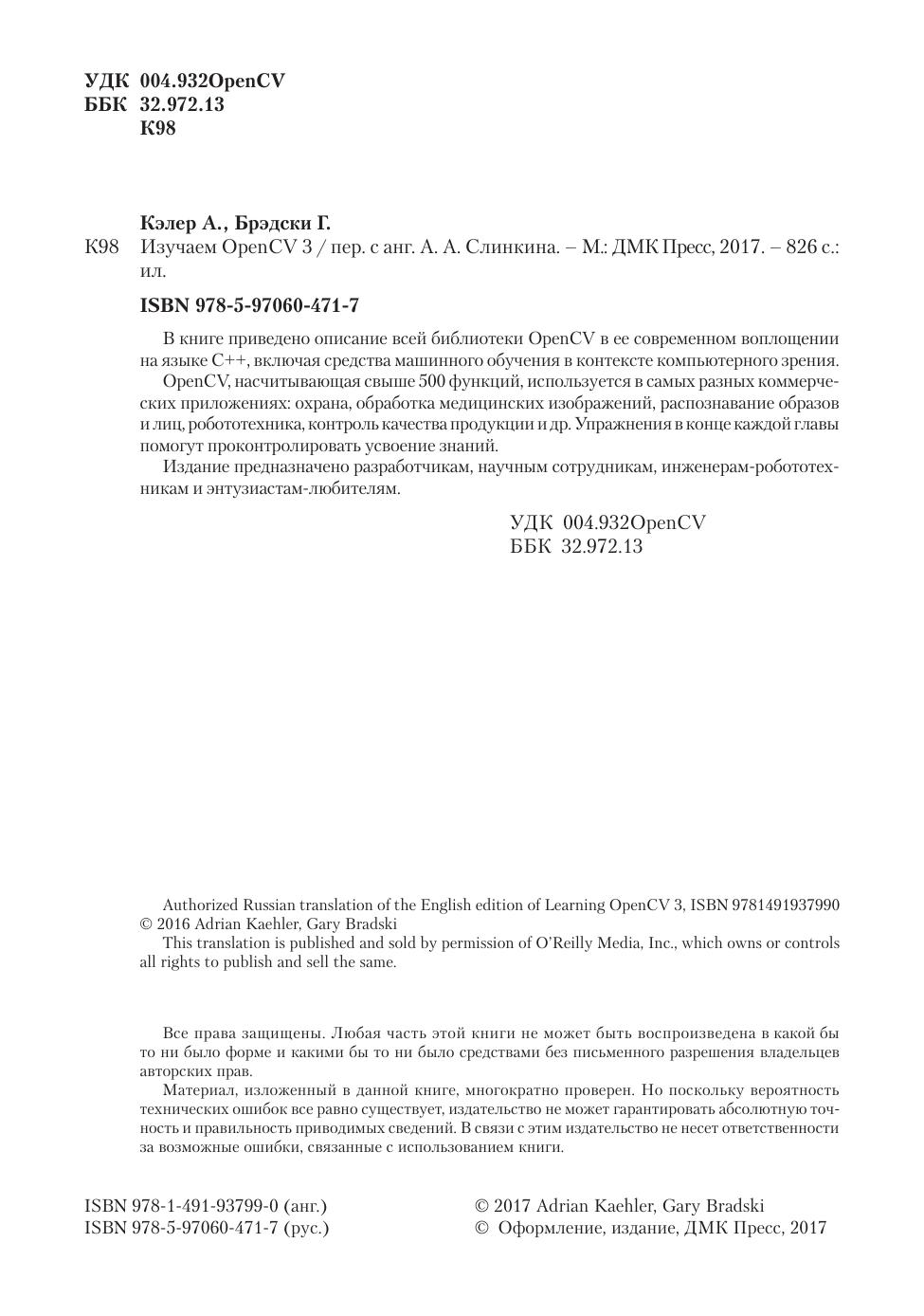 В книге приведено описание всей библиотеки OpenCV в ее современном воплощении на языке C++, включая средства машинного обучения в контексте компьютерного зрения. OpenCV, насчитывающая свыше 500 функций, используется в самых разных коммерческих приложениях: охрана, обработка медицинских изображений, распознавание образов и лиц, робототехника, контроль качества продукции и др. Упражнения в конце каждой главы помогут проконтролировать усвоение знаний. Издание предназначено разработчикам, научным сотрудникам, инженерам-робототехникам и энтузиастам-любителям.