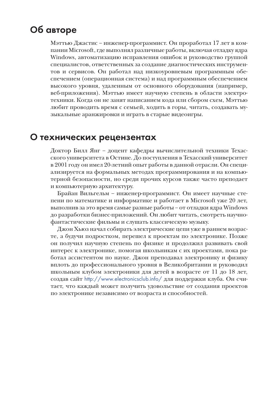 Эта книга по экосистеме персонального компьютера: от оперативной памяти, тактовых сигналов и машинного кода до языков программирования, операционных систем и интернета. Но вы не просто изучите теорию – вы сможете проверить свои знания с помощью упражнений, а также выполните 41 проект для закрепления пройденного. Подробные схемы и рисунки в книге помогают прояснить технические сложности.