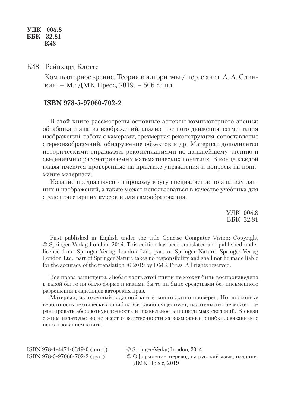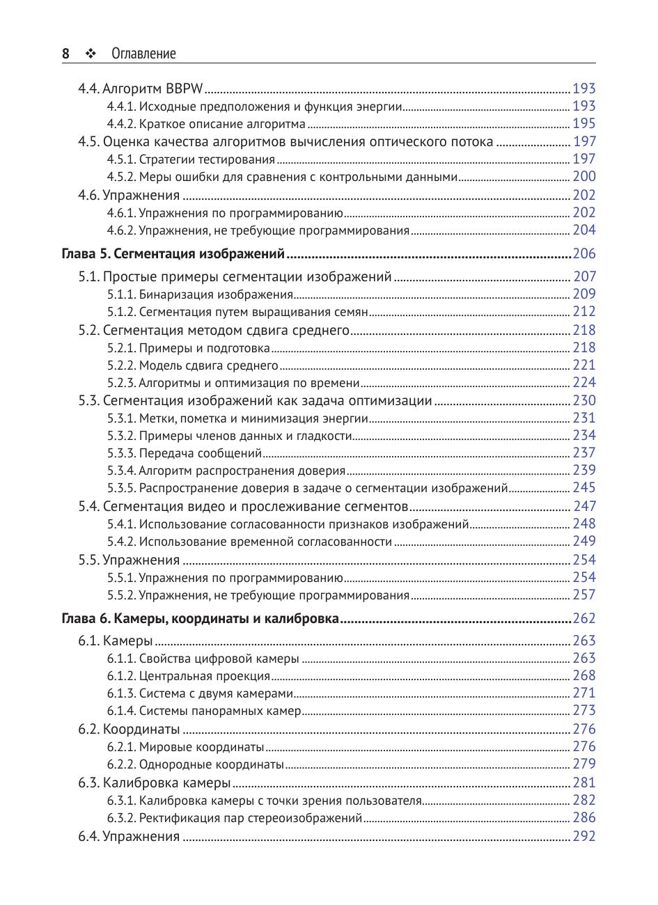 В этой книге вы найдете доступное введение в основные аспекты компьютерного зрения: обработку и анализ изображений, анализ плотного движения, сегментация изображений, работа с камерами, трехмерная реконструкция, сопоставление стереоизображений, обнаружение объектов и др. Материал дополняется историческими справками, рекомендациями по дальнейшему чтению и сведениями о рассматриваемых математических понятиях. В конце каждой главы имеются проверенные на практике упражнения и вопросы на понимание материала.