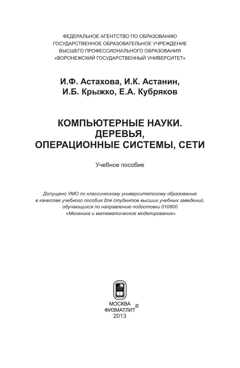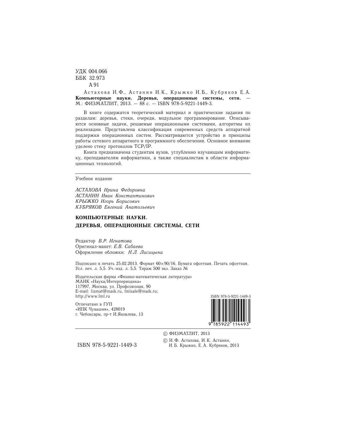 В книге содержатся теоретический материал и практические задания по разделам: деревья, стеки, очереди, модульное программирование. Описываются основные задачи, решаемые операционными системами, алгоритмы их реализации. Представлена классификация современных средств аппаратной поддержки операционных систем. Рассматриваются устройство и принципы работы сетевого аппаратного и программного обеспечения. Основное внимание уделено стеку протоколов TCP/IP. Книга предназначена студентам вузов, углубленно изучающим информатику, преподавателям информатики, а также специалистам в области информационных технологий.