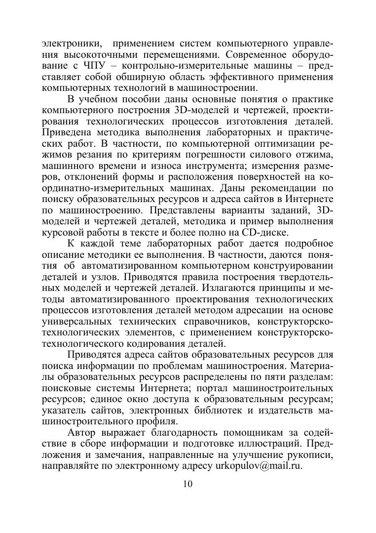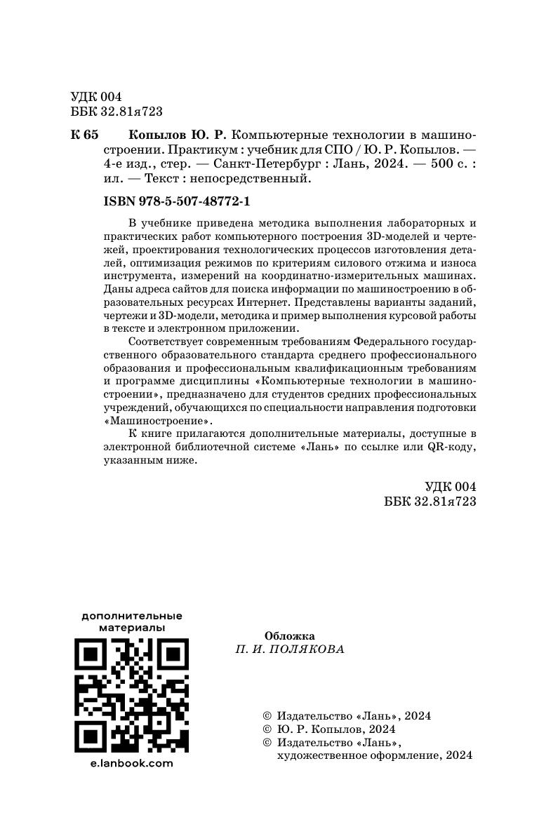 В учебнике приведена методика выполнения лабораторных и практических работ компьютерного построения 3D-моделей и чертежей, проектирования технологических процессов изготовления деталей, оптимизация режимов по критериям силового отжима и износа инструмента, измерений на координатно-измерительных машинах. Даны рекомендации адреса сайтов для поиска информации по машиностроению в образовательных ресурсах Интернет. Представлены варианты заданий, чертежи и 3D-модели, методика и пример выполнения курсовой работы в тексте и в электронном приложении. Соответствует современным требованиям Федерального государственного образовательного стандарта среднего профессионального образования и профессиональным квалификационным требованиям. Издание соответствует программе дисциплины «Компьютерные технологии в машиностроении» , предназначено для студентов средних профессиональных учреждений, обучающихся по специальностям направления подготовки «Машиностроение». К книге прилагаются дополнительные материалы, доступные в электронной библиотечной системе «Лань» по ссылке или QR-коду, указанным ниже.
