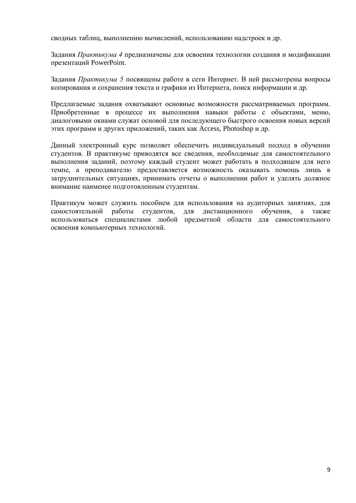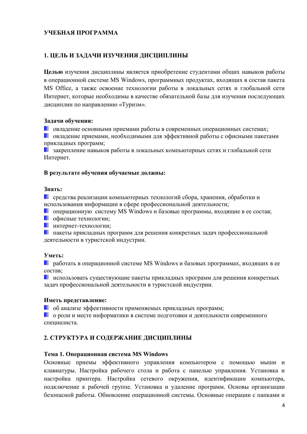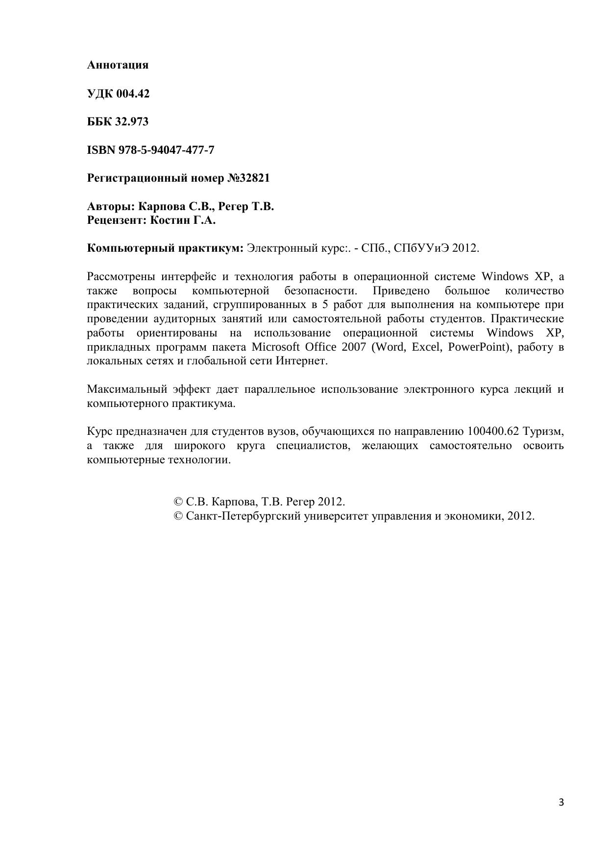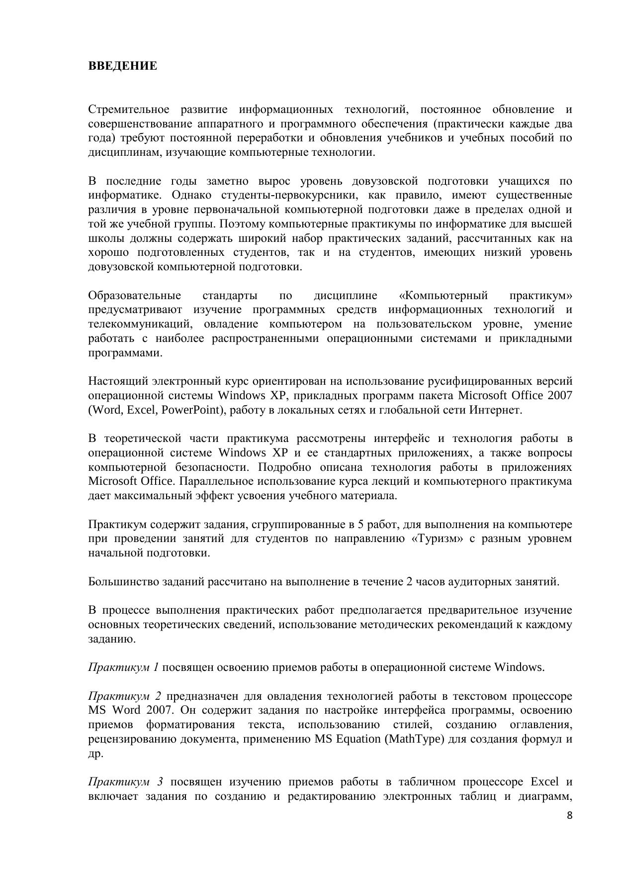 Рассмотрены интерфейс и технология работы в операционной системе Windows XP, а также вопросы компьютерной безопасности. Приведено большое количество практических заданий, сгруппированных в 5 работ для выполнения на компьютере при проведении аудиторных занятий или самостоятельной работы студентов. Практические работы ориентированы на использование операционной системы Windows XP, прикладных программ пакета Microsoft Office 2007 (Word, Excel, PowerPoint), работу в локальных сетях и глобальной сети Интернет. Максимальный эффект дает параллельное использование электронного курса лекций и компьютерного практикума. Курс предназначен для студентов вузов, обучающихся по направлению 100400.62 Туризм, а также для широкого круга специалистов, желающих самостоятельно освоить компьютерные технологии.