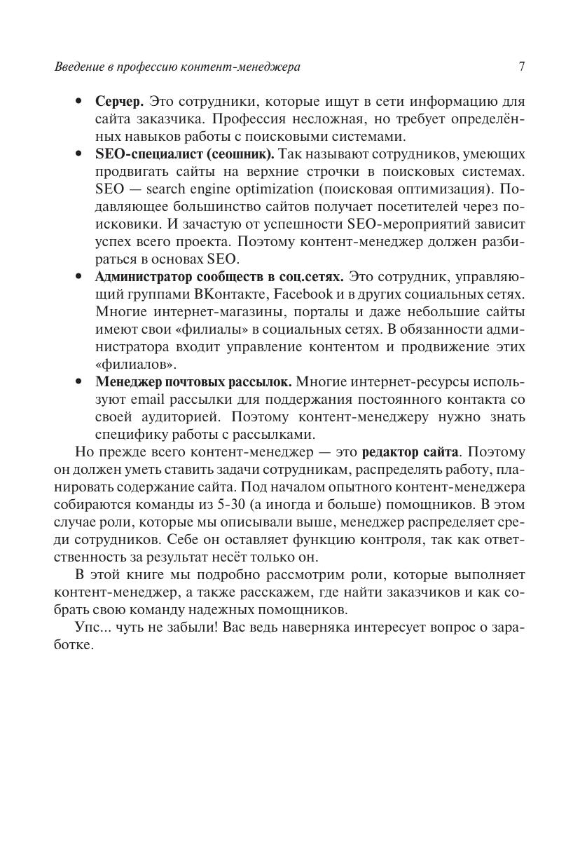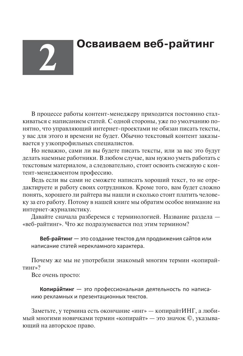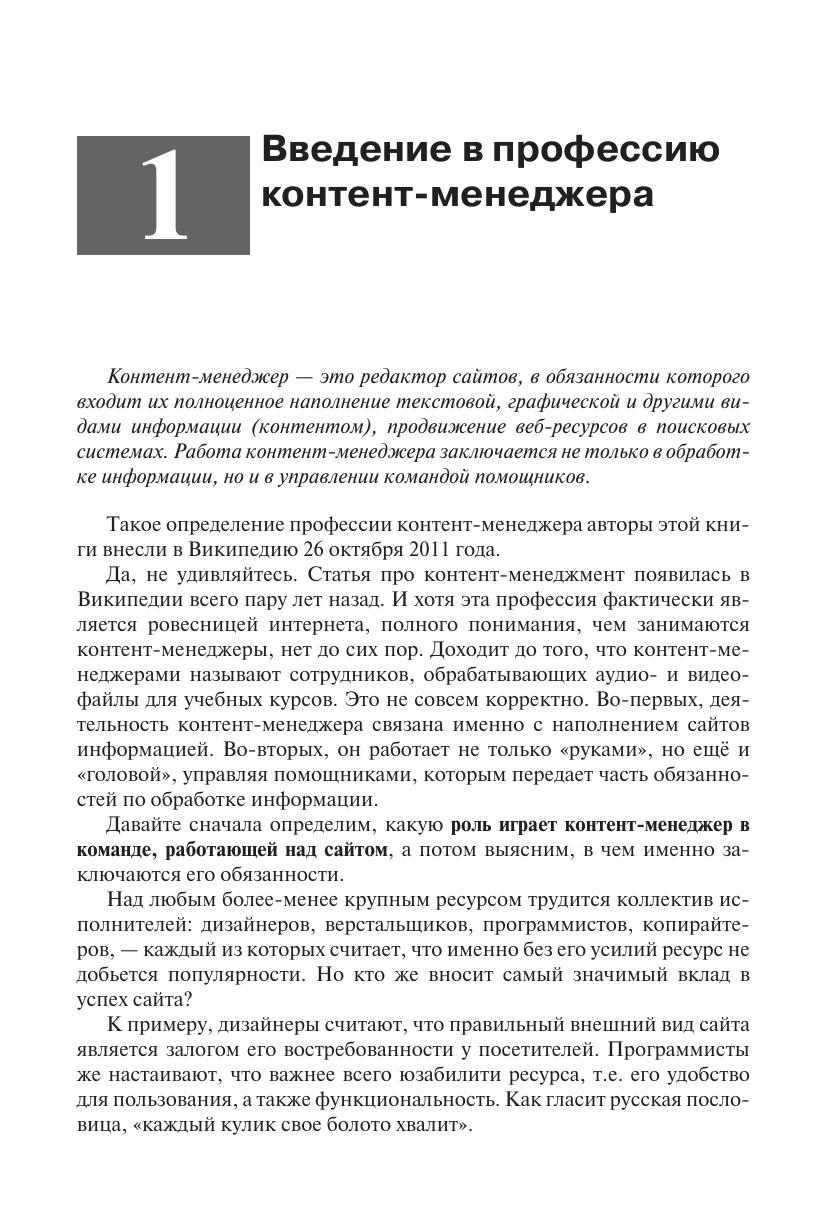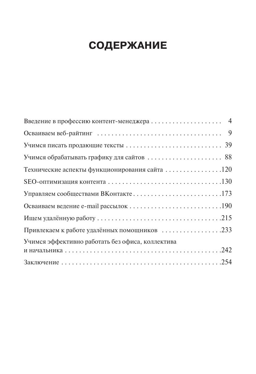 Это первое руководство по контент-менеджменту от российских практиков. В книге подробно разбираются правила создания текстов для сайтов и продающих текстов, методы ведения e-mail рассылок, вопросы управления сообществами ВКонтакте, методы поисковой оптимизации, технические аспекты функционирования сайтов. Отдельное внимание уделено вопросам поиска удаленной работы и формированию команды помощников. Отличительной особенностью книги являются дополнительные статьи и видео-уроки, доступные для бесплатного скачивания на авторском сайте. Это книга для тех, кто ищет надежный способ заработка в интернете. Для тех, кто хочет освоить выгодную и интересную профессию. После изучения книги вы будете полностью готовы к самостоятельной работе в качестве контент-менеджера.