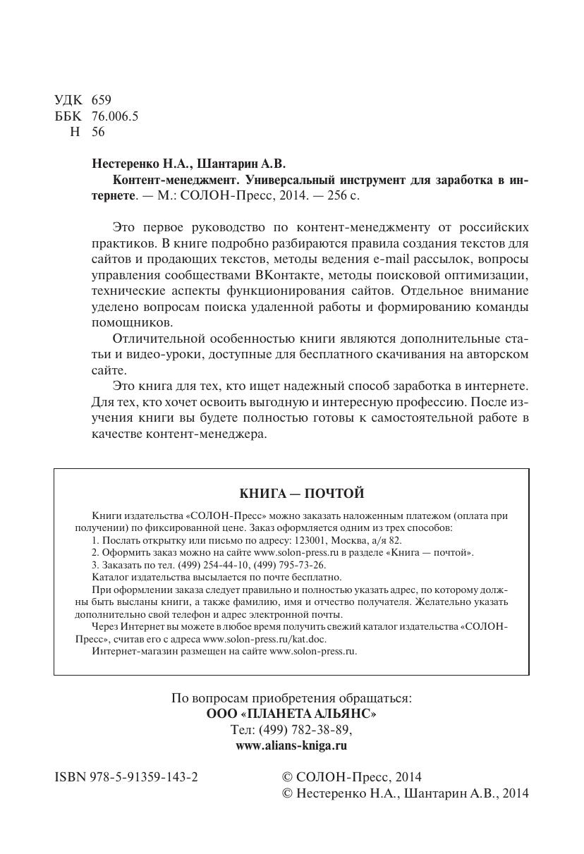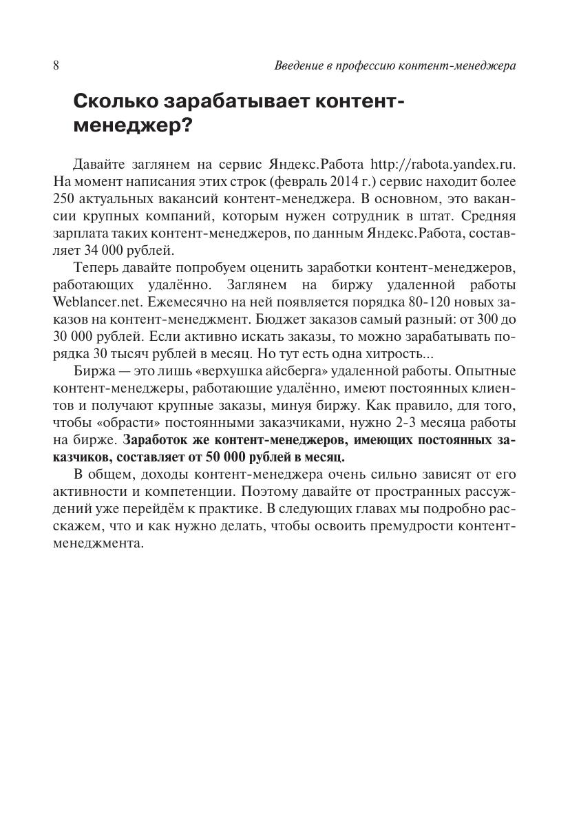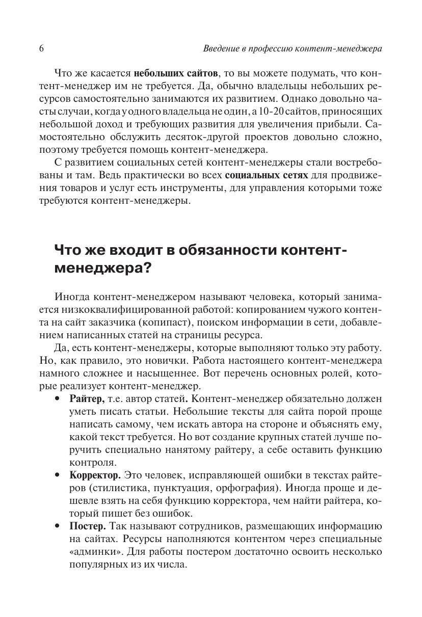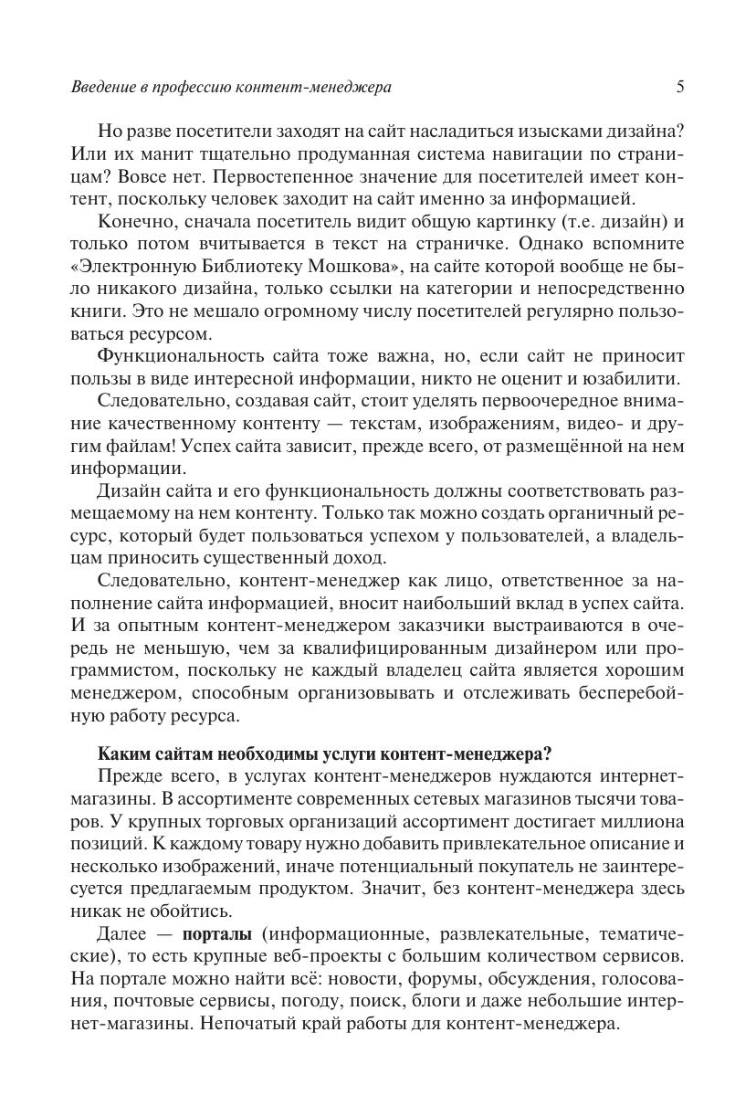 Это первое руководство по контент-менеджменту от российских практиков. В книге подробно разбираются правила создания текстов для сайтов и продающих текстов, методы ведения e-mail рассылок, вопросы управления сообществами ВКонтакте, методы поисковой оптимизации, технические аспекты функционирования сайтов. Отдельное внимание уделено вопросам поиска удаленной работы и формированию команды помощников. Отличительной особенностью книги являются дополнительные статьи и видео-уроки, доступные для бесплатного скачивания на авторском сайте. Это книга для тех, кто ищет надежный способ заработка в интернете. Для тех, кто хочет освоить выгодную и интересную профессию. После изучения книги вы будете полностью готовы к самостоятельной работе в качестве контент-менеджера.