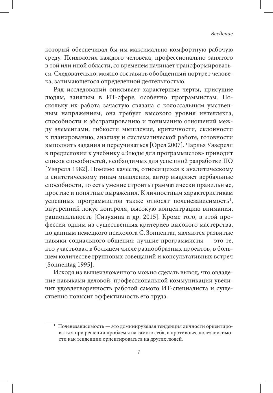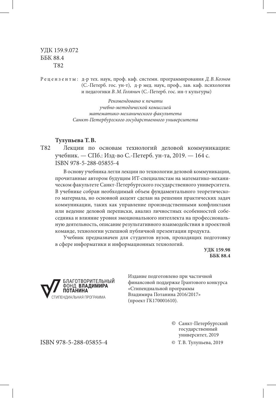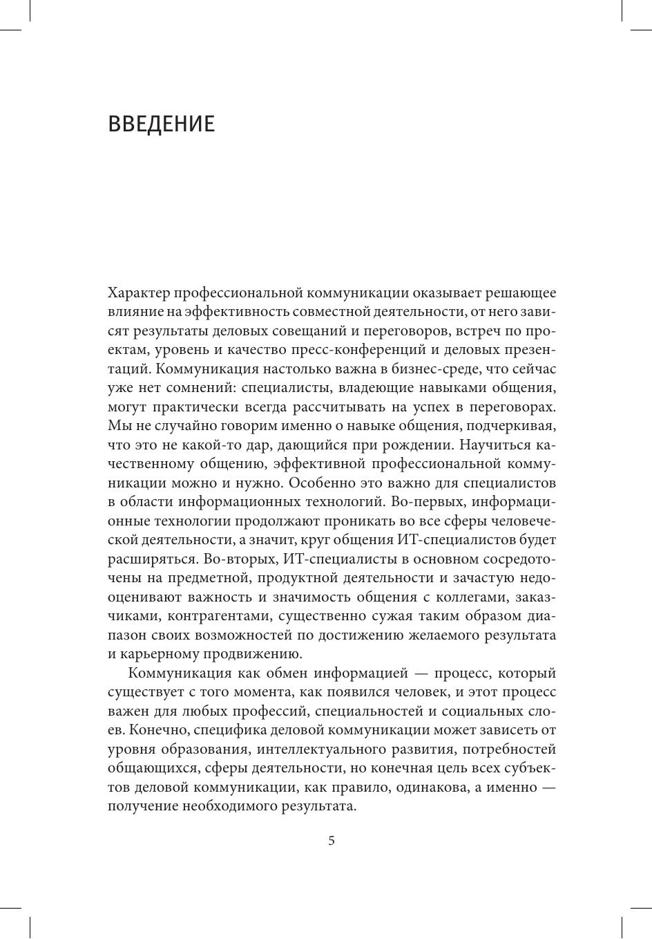 В основу учебника легли лекции по технологии деловой коммуникации, прочитанные автором будущим ИT-специалистам на математико-механическом факультете Санкт-Петербургского государственного университета. В учебнике собран необходимый объем фундаментального теоретического материала, но основной акцент сделан на решении практических задач коммуникации, таких как управление производственными конфликтами или ведение деловой переписки, анализ личностных особенностей собеседника и влияние уровня эмоционального интеллекта на профессиональную деятельность, описание результативного взаимодействия в проектной команде, технологии успешной публичной презентации продукта.