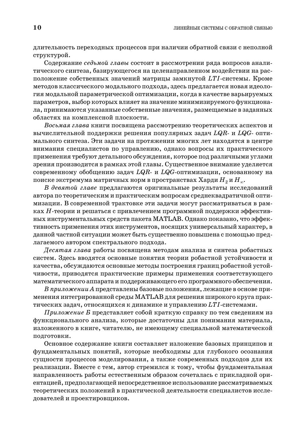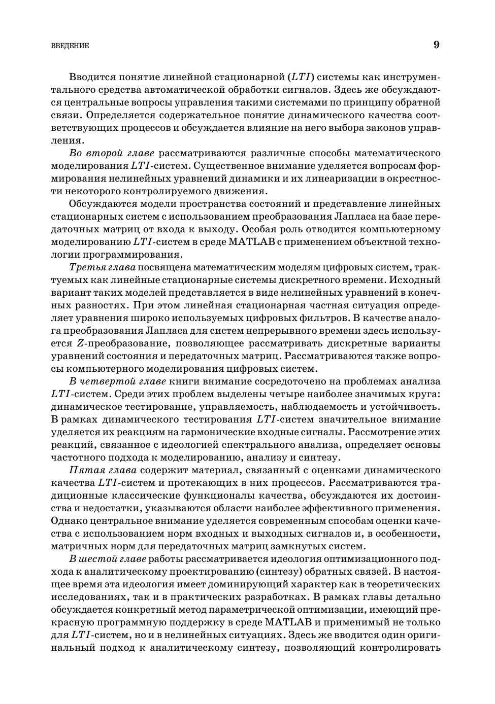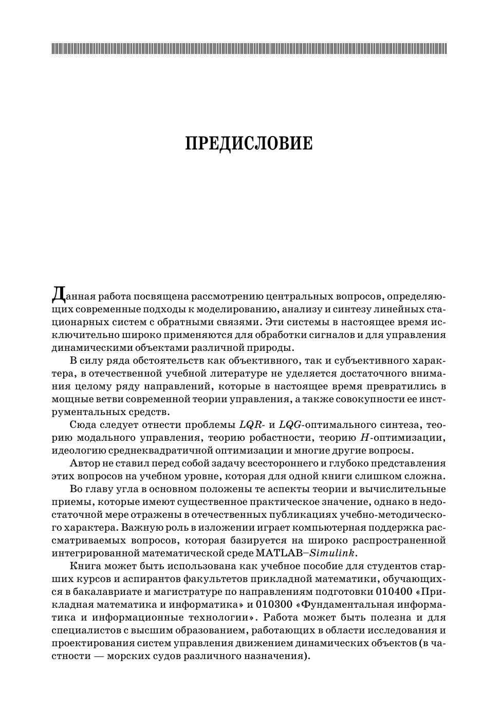 Книга посвящена рассмотрению центральных вопросов, определяющих современные подходы к моделированию, анализу и синтезу линейных стационарных систем с обратными связями. Эти системы в настоящее время исключительно широко применяются для обработки сигналов и для управления динамическими объектами различной природы. Во главу угла в основном поставлены те аспекты теории и практические приемы, которые в недостаточной мере отражены в отечественных публикациях. Важную роль в изложении играет компьютерная поддержка рассматриваемых вопросов, которая базируется на широко распространенной интегрированной среде MATLAB–Simulink. Книга может быть использована как учебное пособие для студентов старших курсов и аспирантов факультетов прикладной математики, обучающихся в бакалавриате и магистратуре по направлениям «Прикладная математика и информатика» и «Фундаментальная информатика и информационные технологии». Книга может быть полезна и для специалистов с высшим образованием, работающих в области проектирования систем управления движением динамических объектов (в частности — морских судов различного назначения).