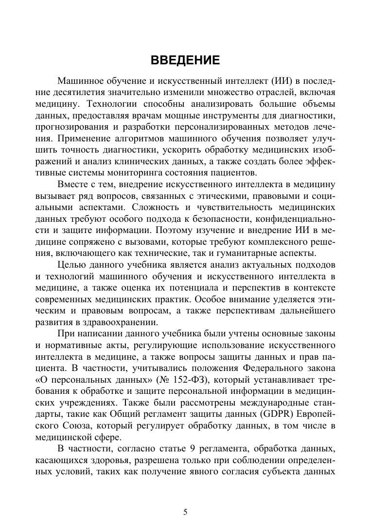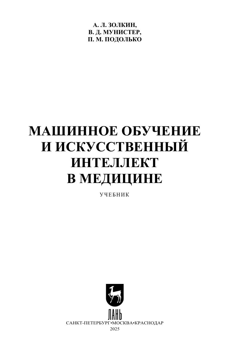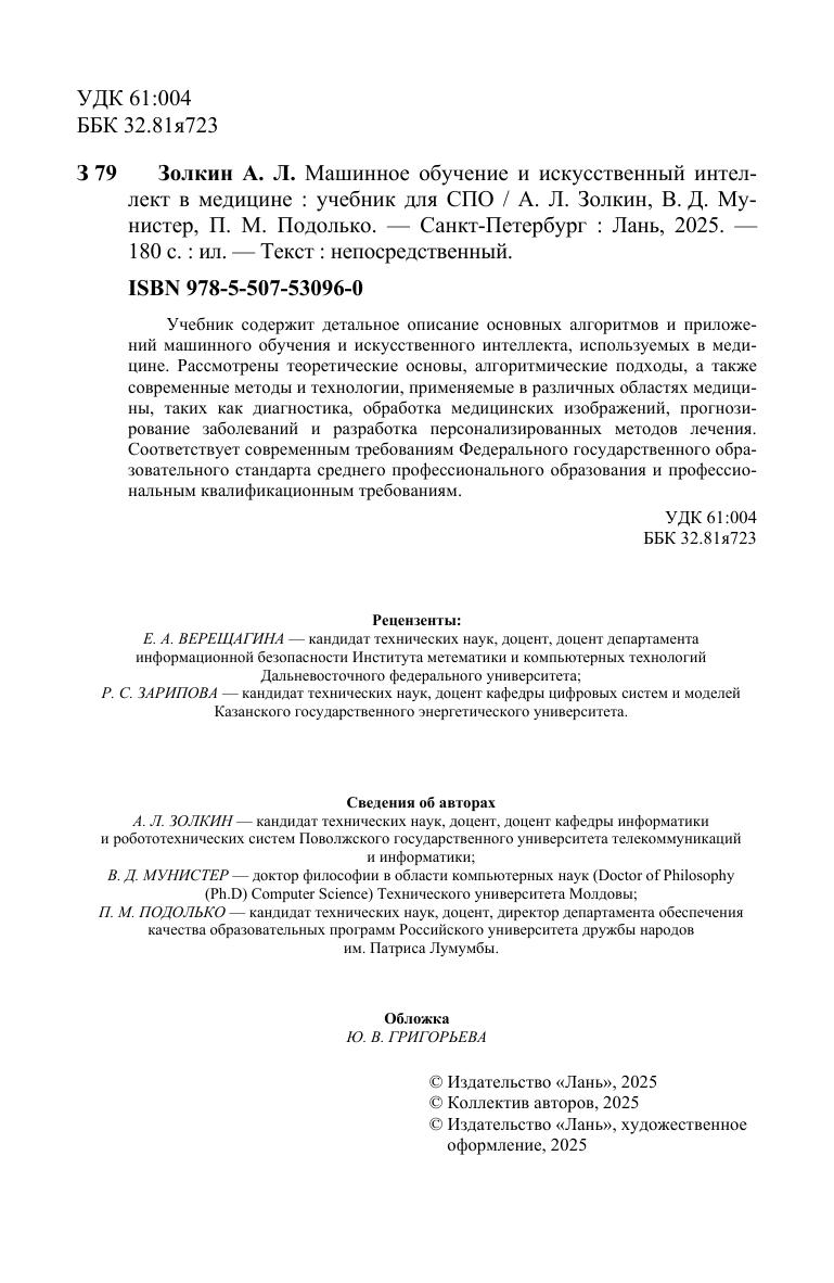 Учебник содержит детальное описание основных алгоритмов и приложений машинного обучения и искусственного интеллекта, используемых в медицине. Рассмотрены теоретические основы, алгоритмические подходы, а также современные методы и технологии, применяемые в различных областях медицины, таких как диагностика, обработка медицинских изображений, прогнозирование заболеваний и разработка персонализированных методов лечения. Соответствует современным требованиям Федерального государственного образовательного стандарта среднего профессионального образования и профессиональным квалификационным требованиям.