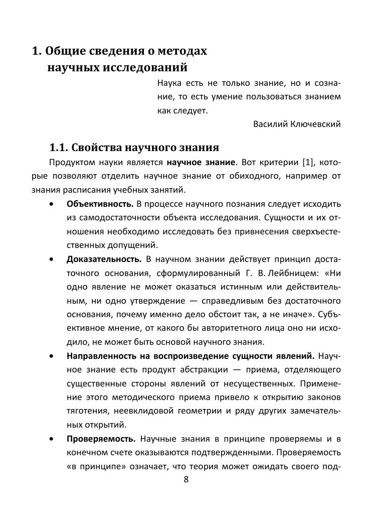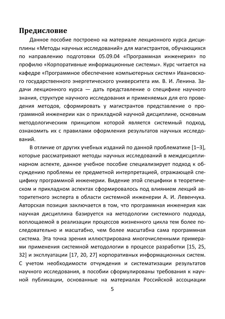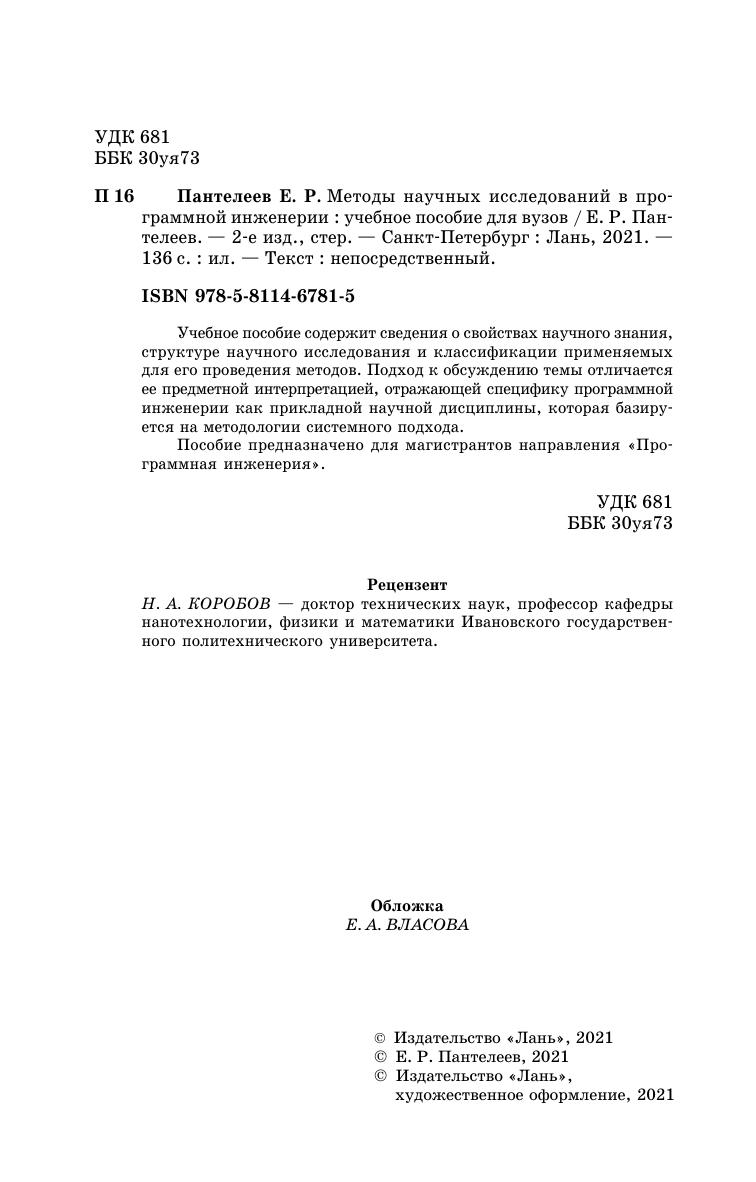Учебное пособие содержит сведения о свойствах научного знания, структуре научного исследования и классификации применяемых для его проведения методов. Подход к обсуждению темы отличается ее предметной интерпретацией, отражающей специфику программной инженерии как прикладной научной дисциплины, которая базируется на методологии системного подхода.