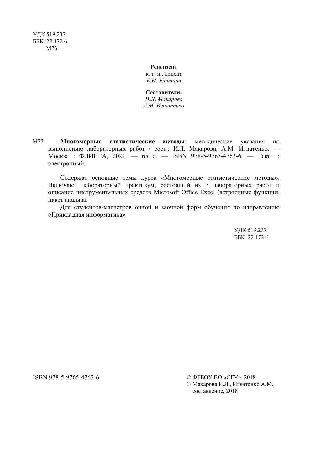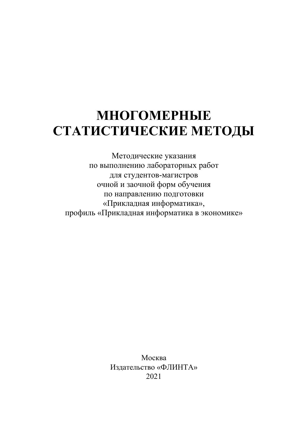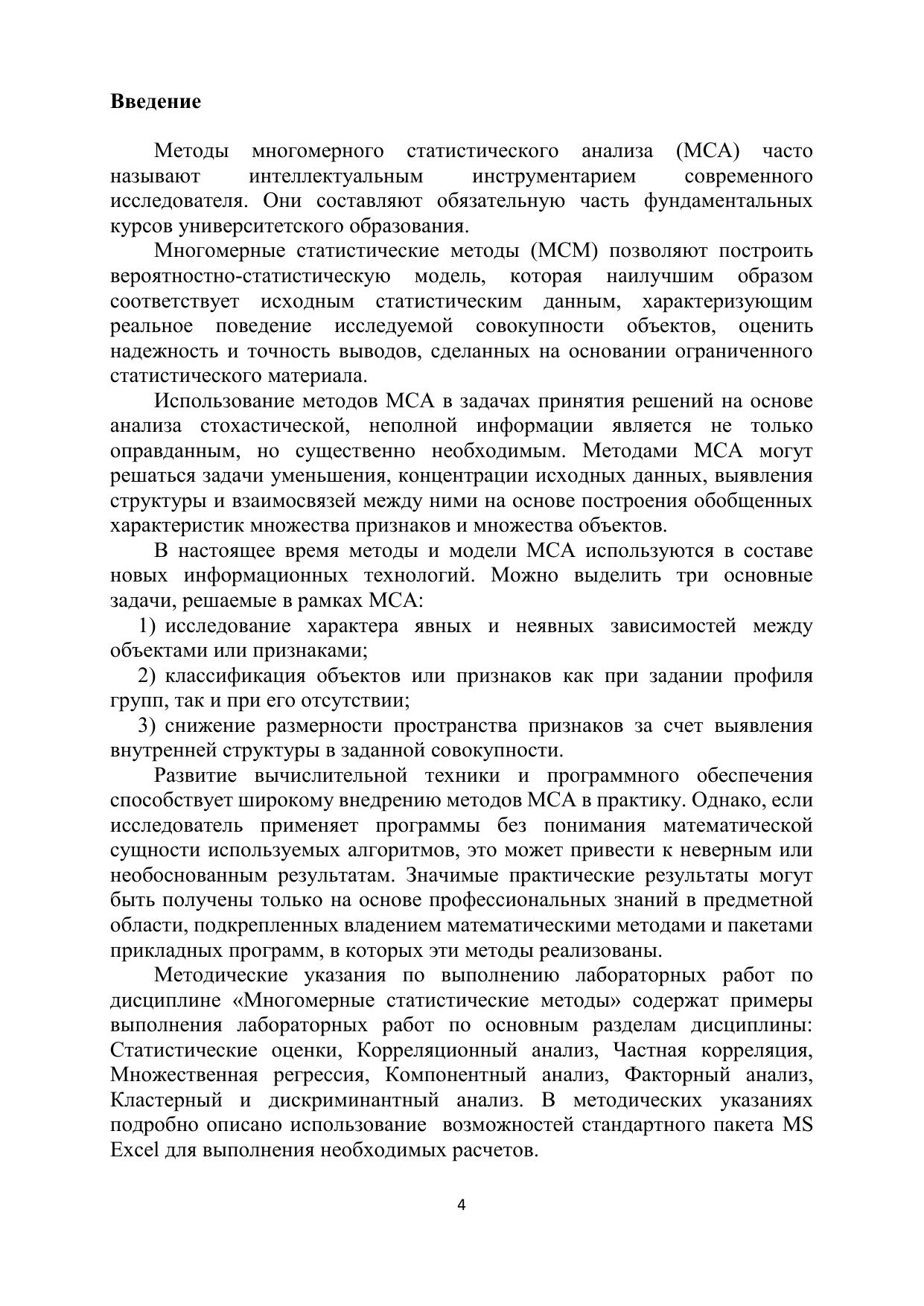 Содержат основные темы курса «Многомерные статистические методы». Включают лабораторный практикум, состоящий из 7 лабораторных работ и описание инструментальных средств Microsoft Office Excel (встроенные функции, пакет анализа.