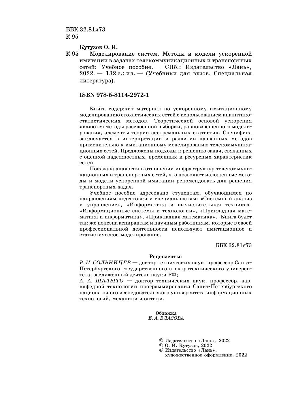 Книга содержит материал по ускоренному имитационному моделированию стохастических сетей с использованием аналитико-статистических методов. Теоретической основой ускорения являются методы расслоенной выборки, равновзвешенного моделирования, элементы теории экстремальных статистик. Специфика заключается в интерпретации и развитии названных методов применительно к имитационному моделированию телекоммуникационных сетей. Предложены подходы к решению задач, связанных с оценкой надежностных, временных и ресурсных характеристик сетей. Показана аналогия в отношении инфраструктур телекоммуникационных и транспортных сетей, что позволяет изложенные методы и модели ускоренной имитации рекомендовать для решения транспортных задач. Учебное пособие адресовано студентам, обучающимся по направлениям подготовки и специальностям: «Системный анализ и управление», «Информатика и вычислительная техника», «Информационные системы и технологии», «Прикладная математика и информатика», «Прикладная математика». Книга будет также полезна аспирантам и научным работникам, которые в своей профессиональной деятельности используют имитационное и статистическое моделирование.