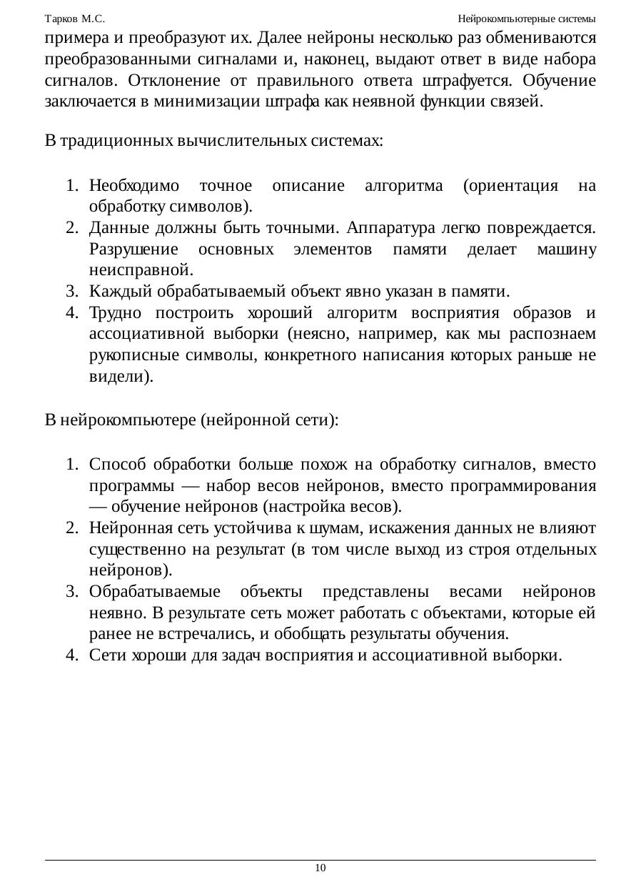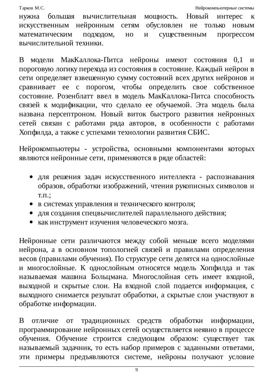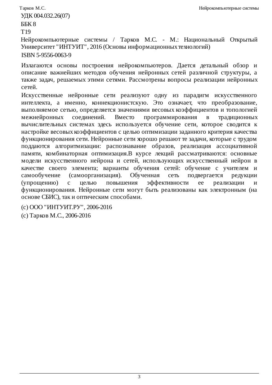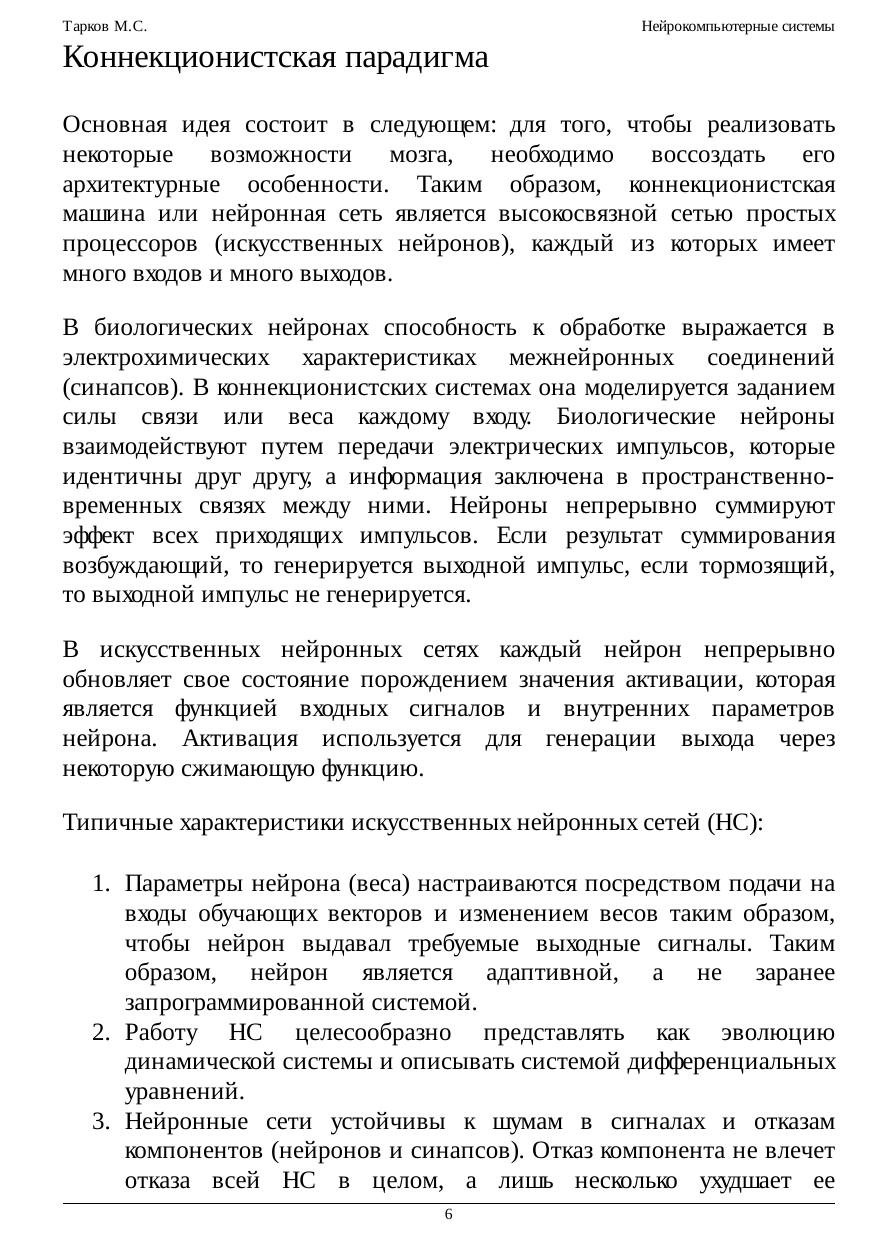 Излагаются основы построения нейрокомпьютеров. Дается детальный обзор и описание важнейших методов обучения нейронных сетей различной структуры, а также задач, решаемых этими сетями. Рассмотрены вопросы реализации нейронных сетей. Искусственные нейронные сети реализуют одну из парадигм искусственного интеллекта, а именно, коннекционистскую. Это означает, что преобразование, выполняемое сетью, определяется значениями весовых коэффициентов и топологией межнейронных соединений. Вместо программирования в традиционных вычислительных системах здесь используется обучение сети, которое сводится к настройке весовых коэффициентов с целью оптимизации заданного критерия качества функционирования сети. Нейронные сети хорошо решают те задачи, которые с трудом поддаются алгоритмизации: распознавание образов, реализация ассоциативной памяти, комбинаторная оптимизация.В курсе лекций рассматриваются: основные модели искусственного нейрона и сетей, использующих искусственный нейрон в качестве своего элемента; варианты обучения сетей: обучение с учителем и самообучение (самоорганизация). Обученная сеть подвергается редукции (упрощению) с целью повышения эффективности ее реализации и функционирования. Нейронные сети могут быть реализованы как электронным (на основе СБИС), так и оптическим способами.