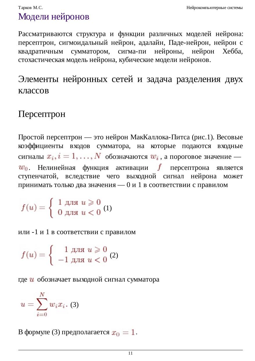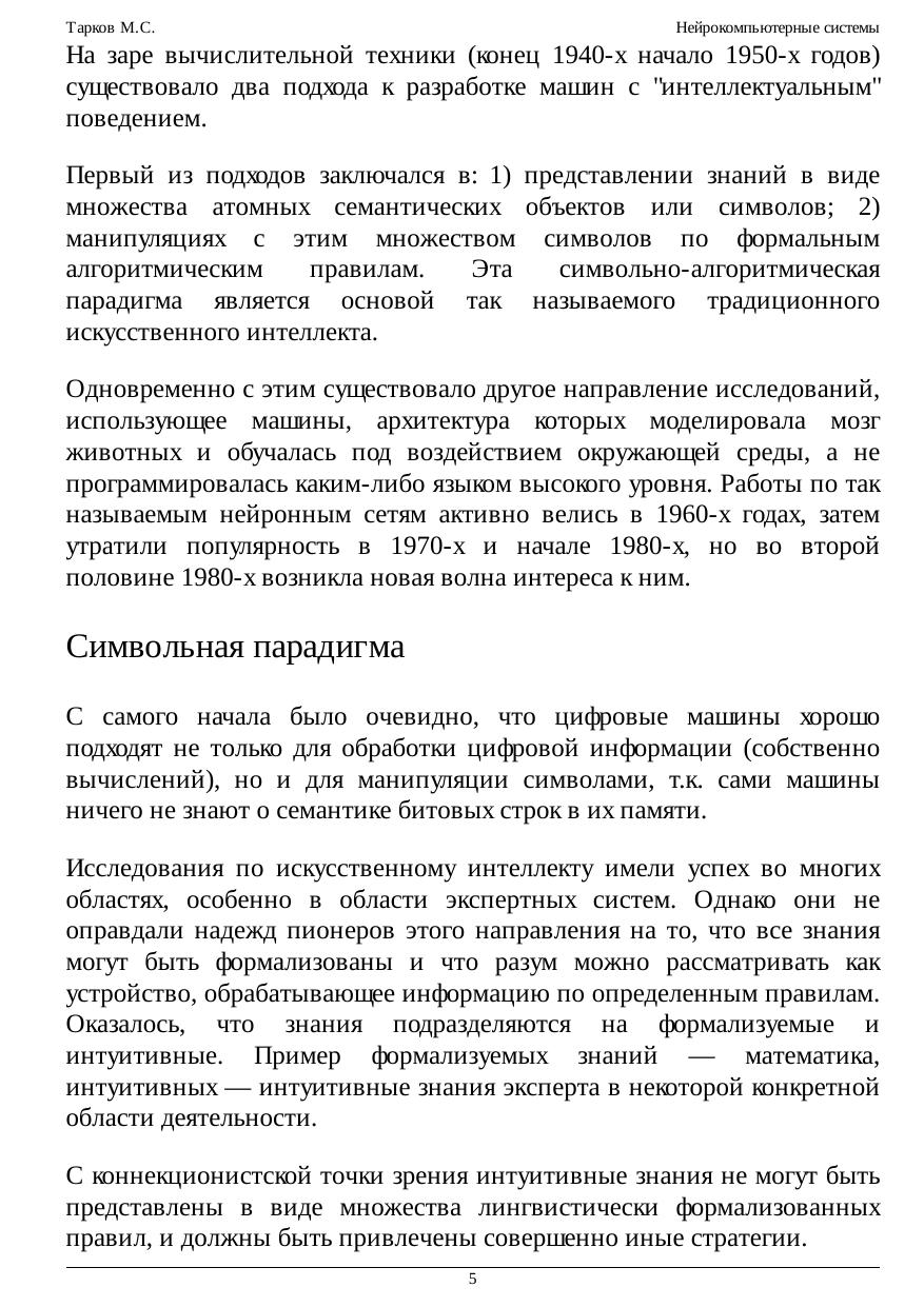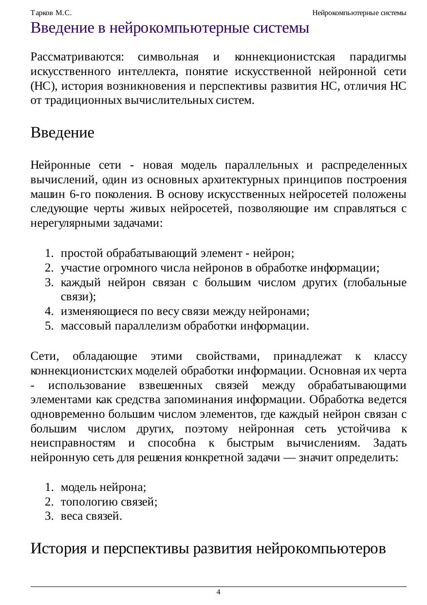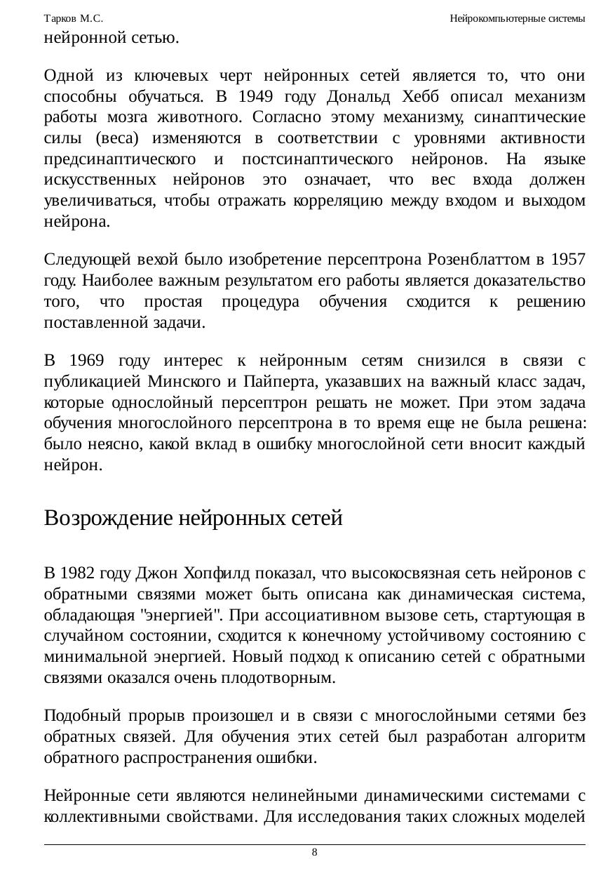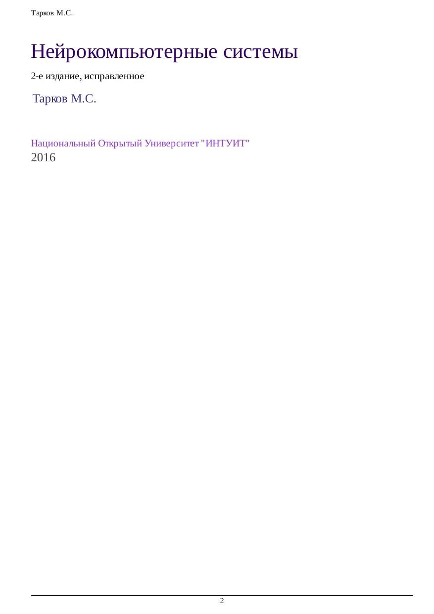 Излагаются основы построения нейрокомпьютеров. Дается детальный обзор и описание важнейших методов обучения нейронных сетей различной структуры, а также задач, решаемых этими сетями. Рассмотрены вопросы реализации нейронных сетей. Искусственные нейронные сети реализуют одну из парадигм искусственного интеллекта, а именно, коннекционистскую. Это означает, что преобразование, выполняемое сетью, определяется значениями весовых коэффициентов и топологией межнейронных соединений. Вместо программирования в традиционных вычислительных системах здесь используется обучение сети, которое сводится к настройке весовых коэффициентов с целью оптимизации заданного критерия качества функционирования сети. Нейронные сети хорошо решают те задачи, которые с трудом поддаются алгоритмизации: распознавание образов, реализация ассоциативной памяти, комбинаторная оптимизация.В курсе лекций рассматриваются: основные модели искусственного нейрона и сетей, использующих искусственный нейрон в качестве своего элемента; варианты обучения сетей: обучение с учителем и самообучение (самоорганизация). Обученная сеть подвергается редукции (упрощению) с целью повышения эффективности ее реализации и функционирования. Нейронные сети могут быть реализованы как электронным (на основе СБИС), так и оптическим способами.