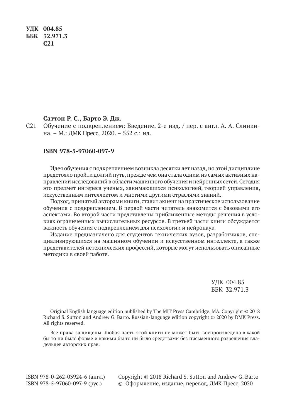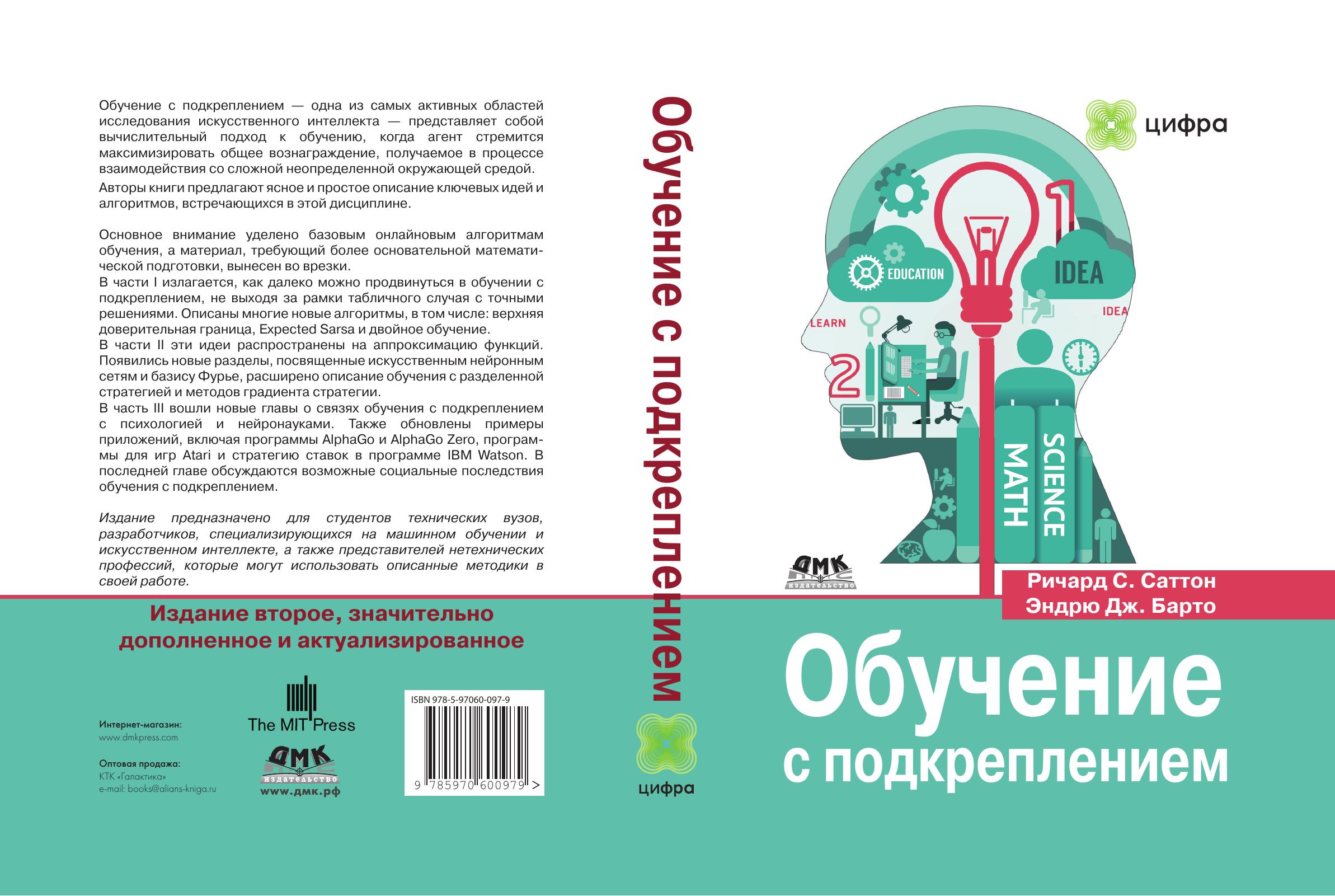 Подход, принятый авторами книги, ставит акцент на практическое использования обучения с подкреплением. В первой части читатель знакомится с базовыми его аспектами. Во второй части представлены приближенные методы решения в условиях ограниченных вычислительных ресурсов. В третьей части книги обсуждается важность обучения с подкреплением для психологии и нейронаук.