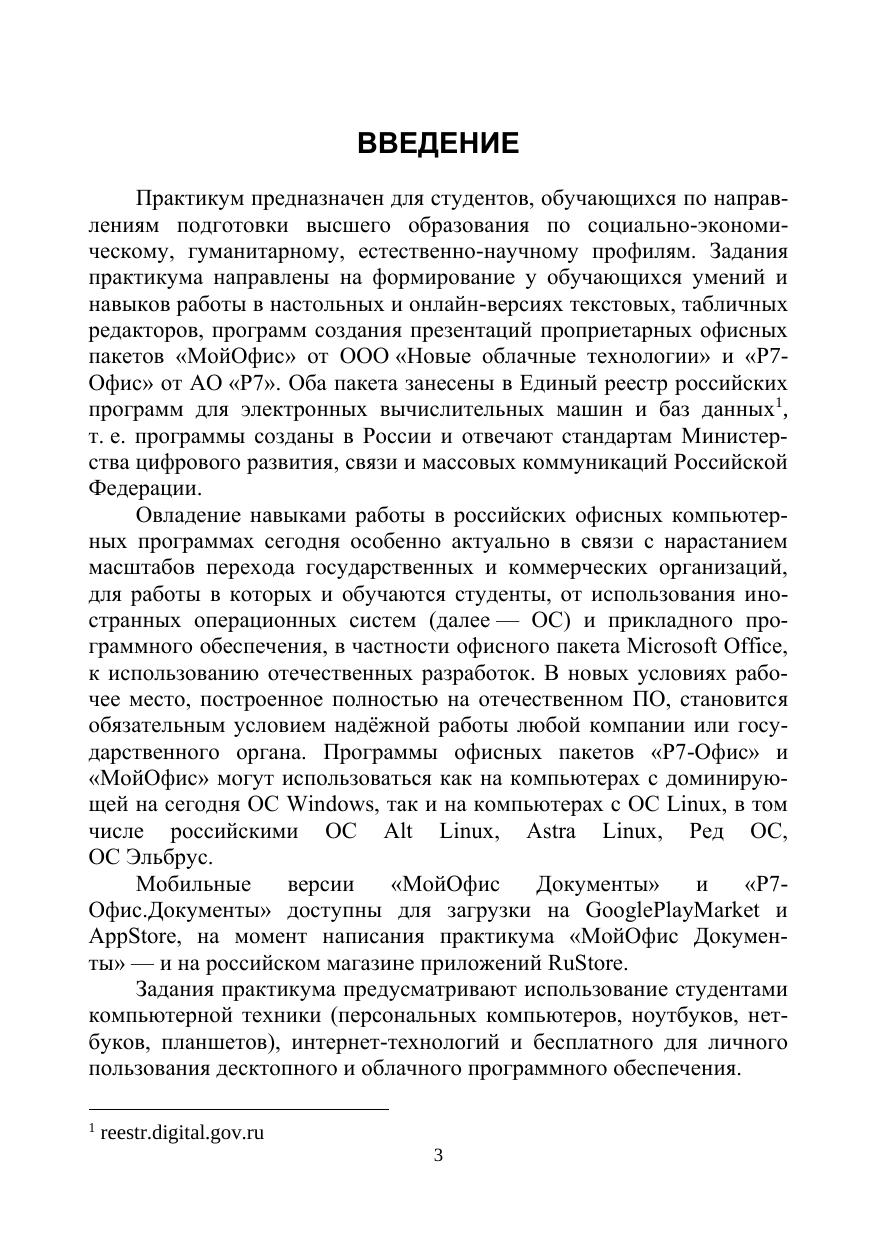 Практикум предназначен для формирования у обучающихся умений и навыков работы в текстовых и табличных редакторах и программах создания и отображения презентаций российских офисных пакетов «МойОфис», «Р7-Офис» при изучении учебных дисциплин «Информатика», «Информационные технологии в профессиональной деятельности» («ИТ в менеджменте», «ИТ в юридической деятельности» и т.п.), в соответствии с федеральными государственными стандартами по направлениям подготовки высшего образования по социально-экономическому, гуманитарному, естественно-научному профилям.