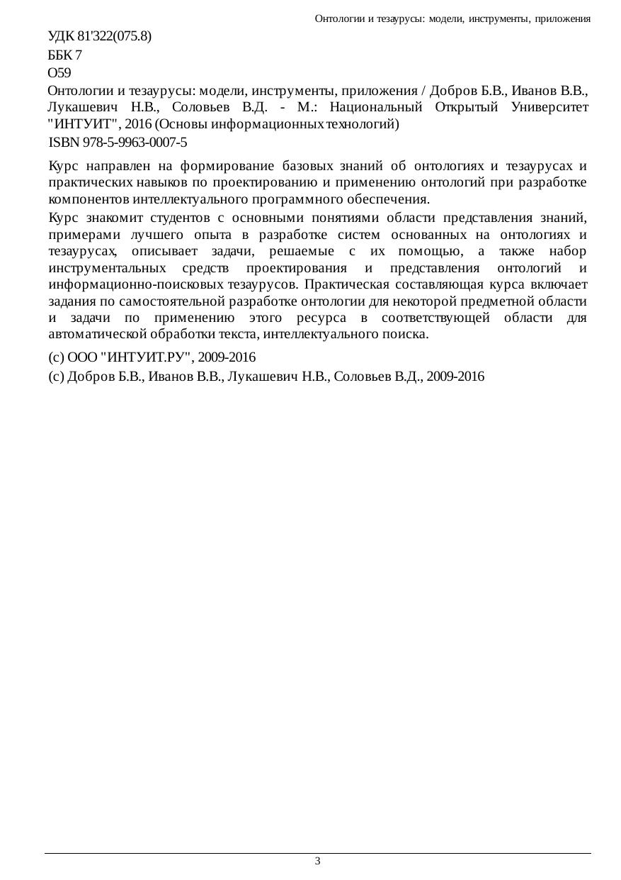 Курс направлен на формирование базовых знаний об онтологиях и тезаурусах и практических навыков по проектированию и применению онтологий при разработке компонентов интеллектуального программного обеспечения. Курс знакомит студентов с основными понятиями области представления знаний, примерами лучшего опыта в разработке систем основанных на онтологиях и тезаурусах, описывает задачи, решаемые с их помощью, а также набор инструментальных средств проектирования и представления онтологий и информационно-поисковых тезаурусов. Практическая составляющая курса включает задания по самостоятельной разработке онтологии для некоторой предметной области и задачи по применению этого ресурса в соответствующей области для автоматической обработки текста, интеллектуального поиска.
