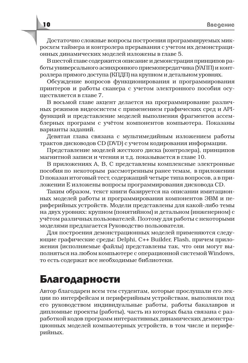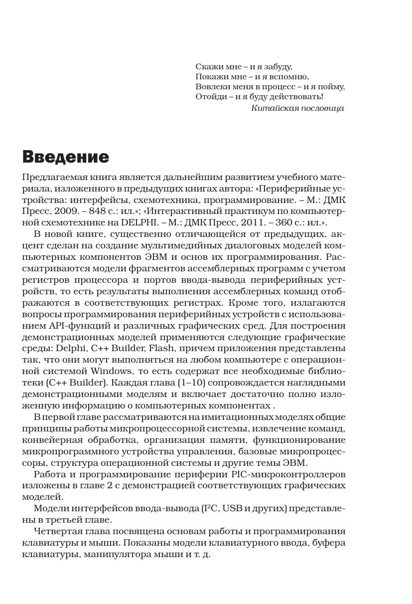 Книга посвящена проблемам развития инновационных образовательных технологий, включает детальное описание и компьютерное моделирование работы компонентов ЭВМ и периферии: микропроцессоров, микроконтроллеров, устройств управления и прерывания, памяти, таймеров, жёстких дисков, принтеров, сканеров, видеосистем, дисководов CD, кодеков и т. д. На разных уровнях с помощью визуальных графических интерактивных демонстрационных моделей и с помощью диска CD, на котором размещено около 140 имитационных моделей, излагается работа и основы программирования компьютерных устройств. Широко представлено компьютерное тестирование по рассмотренным темам и электронные учебные пособия. Показаны динамические модели фрагментов ассемблерных программ, функциональные графы вариантов заданий и образцы программ с использованием API-функций в графических средах. Наглядное обучение, предлагаемое в книге, может быть использовано преподавателями для проведения в увлекательной форме лекционных занятий с помощью проектора и ноутбука. Эта книга предназначена для широкого круга читателей: преподавателей и студентов вузов (колледжей), инженеров и других, изучающих основы компьютерной техники.