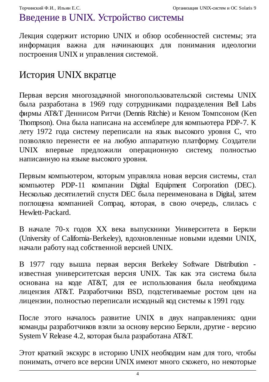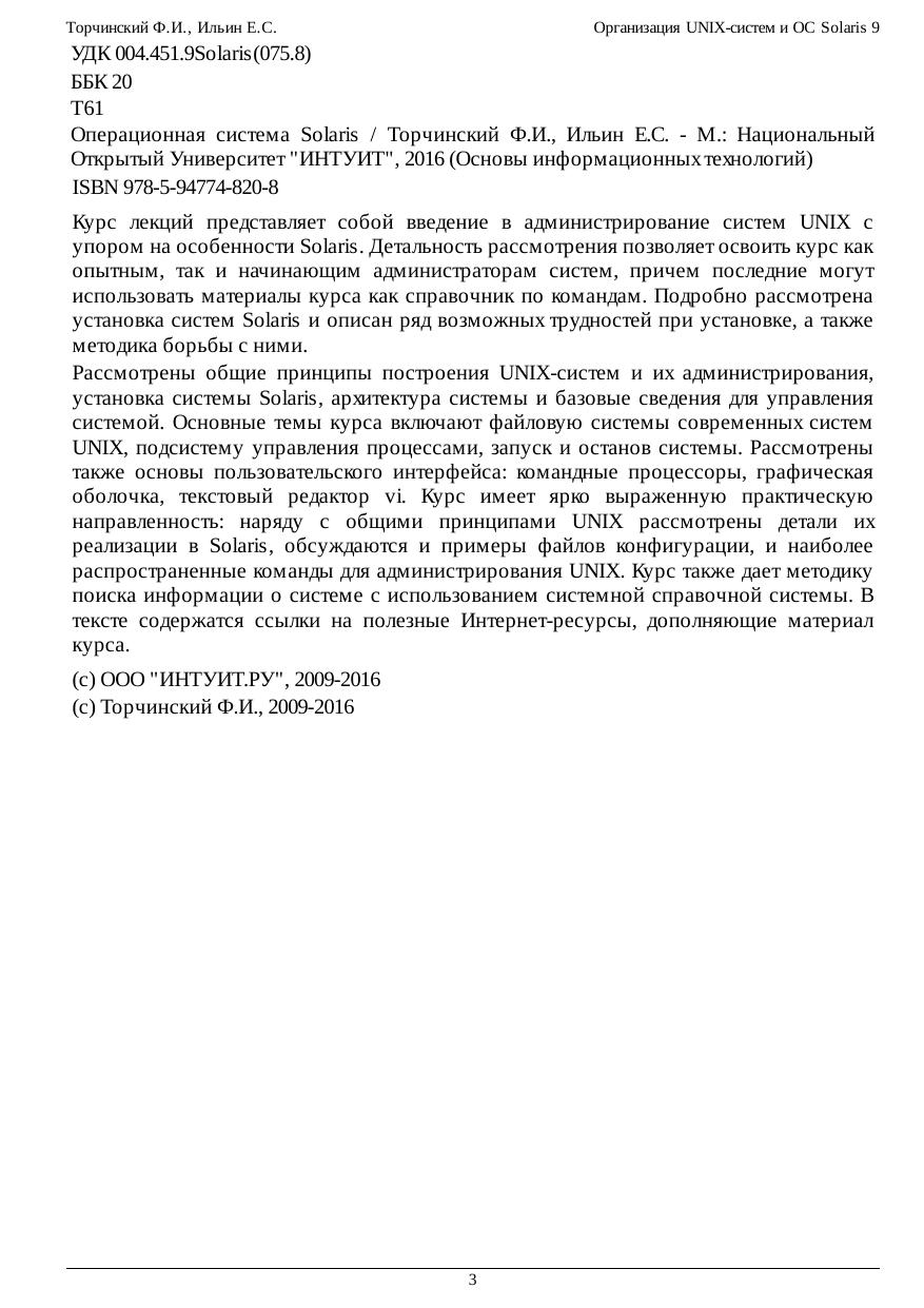 Курс лекций представляет собой введение в администрирование систем UNIX с упором на особенности Solaris. Детальность рассмотрения позволяет освоить курс как опытным, так и начинающим администраторам систем, причем последние могут использовать материалы курса как справочник по командам. Подробно рассмотрена установка систем Solaris и описан ряд возможных трудностей при установке, а также методика борьбы с ними. Рассмотрены общие принципы построения UNIX-систем и их администрирования, установка системы Solaris, архитектура системы и базовые сведения для управления системой. Основные темы курса включают файловую системы современных систем UNIX, подсистему управления процессами, запуск и останов системы. Рассмотрены также основы пользовательского интерфейса: командные процессоры, графическая оболочка, текстовый редактор vi. Курс имеет ярко выраженную практическую направленность: наряду с общими принципами UNIX рассмотрены детали их реализации в Solaris, обсуждаются и примеры файлов конфигурации, и наиболее распространенные команды для администрирования UNIX. Курс также дает методику поиска информации о системе с использованием системной справочной системы. В тексте содержатся ссылки на полезные Интернет-ресурсы, дополняющие материал курса.