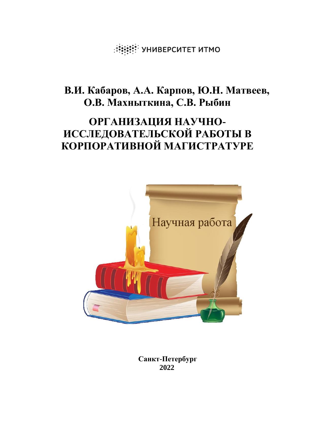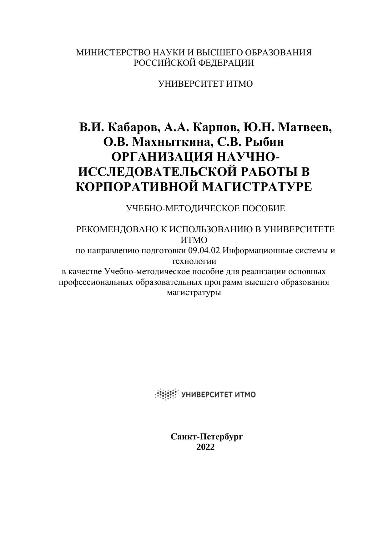 Рассмотрены цели и задачи научно-исследовательской работы, этапы ее выполнения, большое внимание уделено требованиям к структуре, содержанию, оформлению результатов НИР и процедуре защиты в корпоративной магистратуре. Учебно-методическое пособие адресовано студентам магистратуры, обучающимся по направлению «Информационные системы и технологии» и осваивающим образовательную программу по профилю подготовки «Речевые технологии и машинное обучение», а также научным руководителям магистрантов.