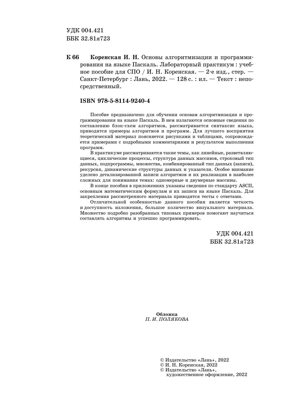 В практикуме рассматриваются такие темы, как линейные, разветвляющиеся, циклические процессы, структура данных массив, строковый тип данных, подпрограммы, множества, комбинированный тип данных (записи), рекурсия, динамические структуры данных и указатели. Особое внимание уделено детализированной записи алгоритмов и их реализации в наиболее сложных для понимания темах: одномерные и двумерные массивы.