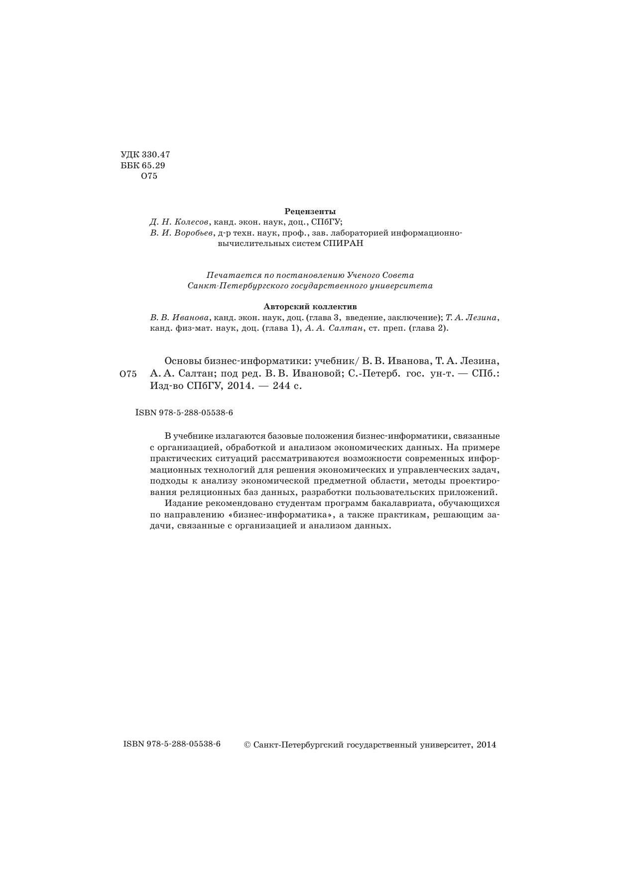 Издание рекомендовано студентам программ бакалавриата, обучающихся по направлению «бизнес-информатика», а также практикам, решающим задачи, связанные с организацией и анализом данных.