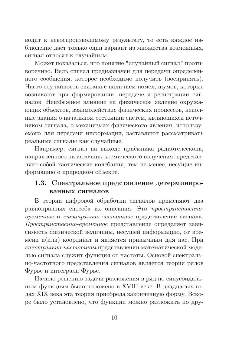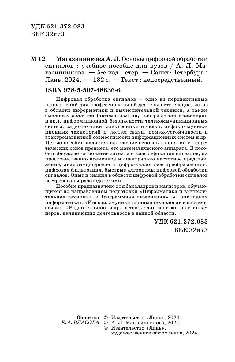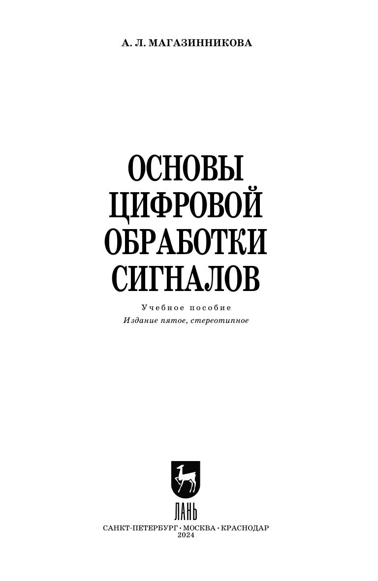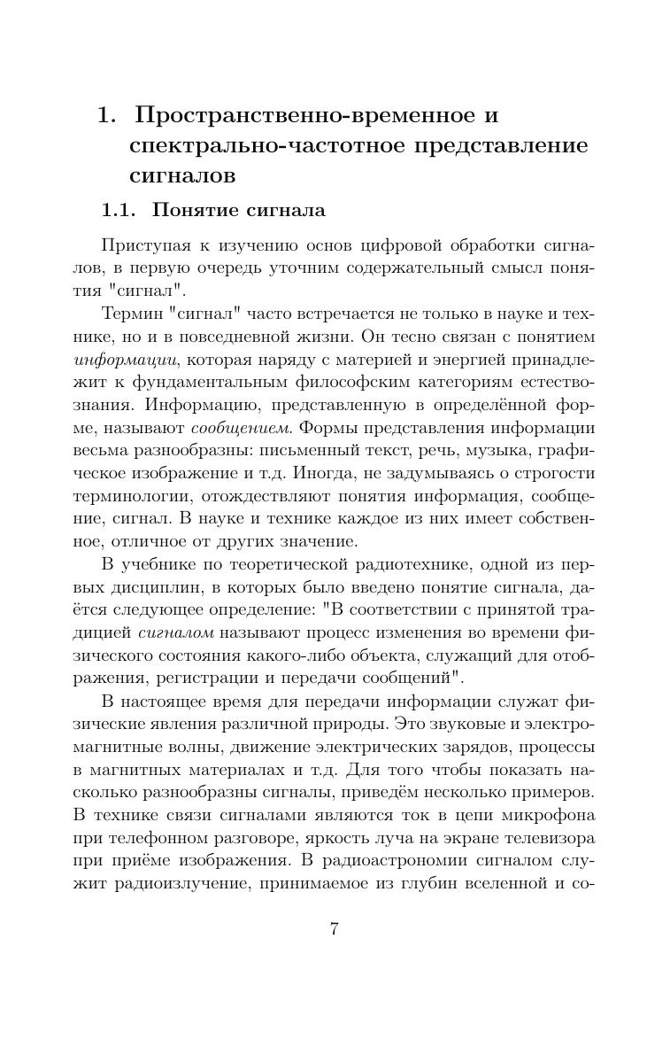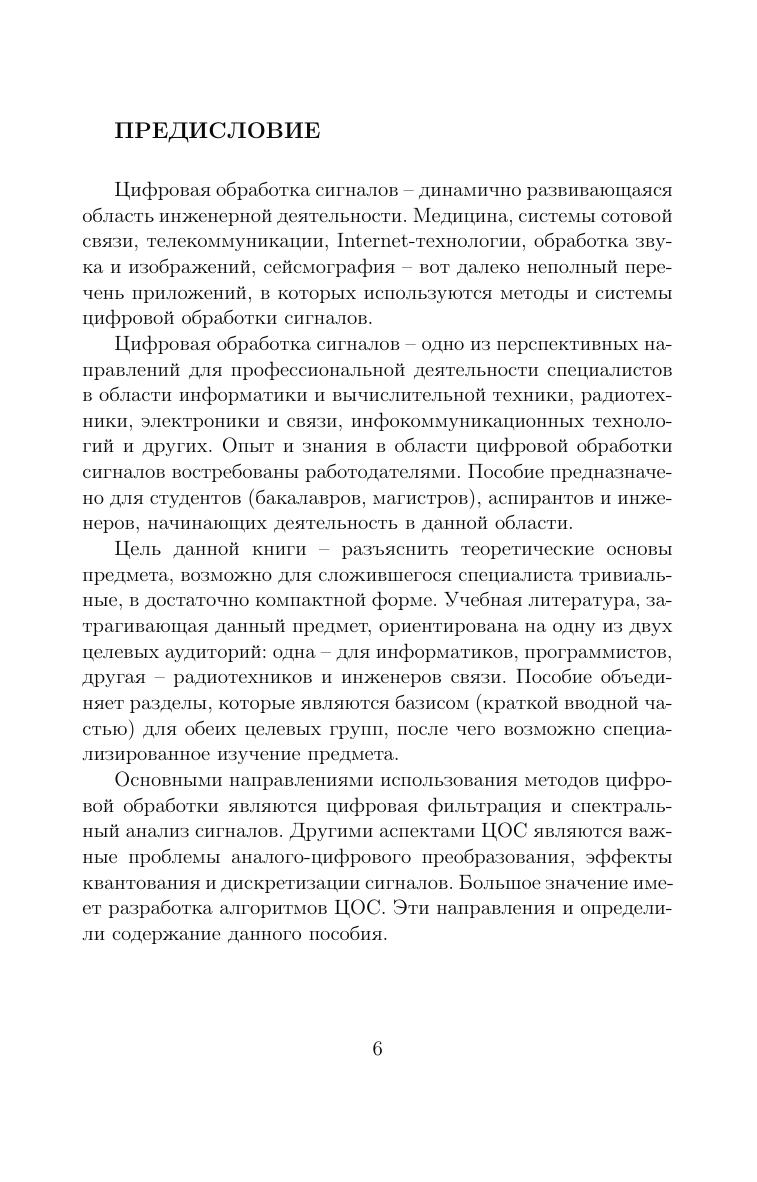 Цифровая обработка сигналов — одно из перспективных направлений для профессиональной деятельности специалистов в области информатики и вычислительной техники, а также смежных областей (автоматизация, программная инженерия и др.), информационной безопасности телекоммуникационных систем, радиотехники, электроники и связи, инфокоммуникационных технологий и систем связи, помехоустойчивости и электромагнитной совместимости информационных систем и др. Целью пособия является изложение основных понятий и теоретических основ предмета, его математического аппарата. В пособии обсуждается понятие сигнала и классификация сигналов, их пространственно-временное и спектрально-частотное представление, аналого-цифровое и цифро-аналоговое преобразования, цифровая фильтрация, быстрые алгоритмы цифровой обработки сигналов. Опыт и знания в области цифровой обработки сигналов востребованы работодателями. Пособие предназначено для студентов (бакалавров, магистров), аспирантов и инженеров, начинающих деятельность в данной области.