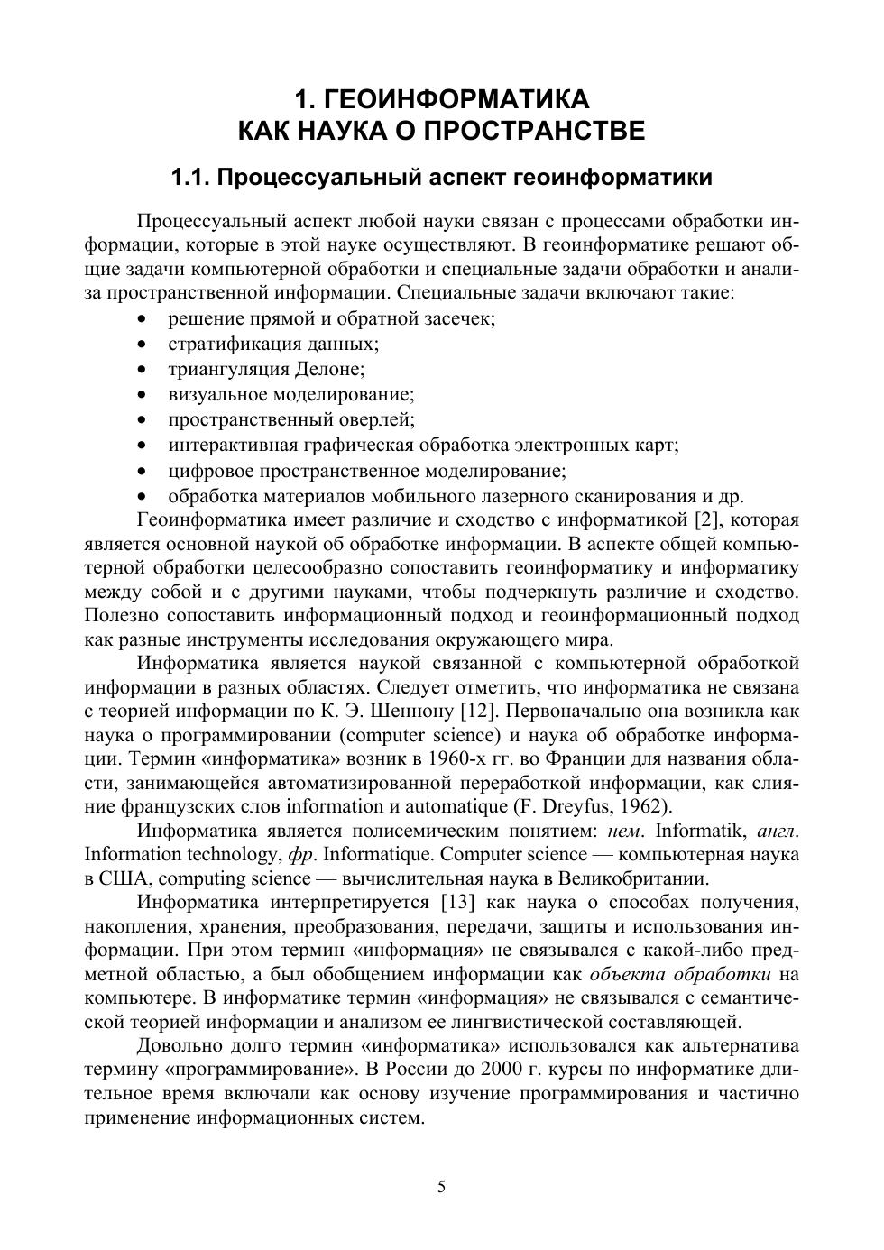 Учебник написан по материалам ряда учебных дисциплин, читаемых в Российском технологическом университете и Московском государственном университете геодезии картографии. Рассматривается содержание пространственного моделирования и пространственного анализа. Показано место геоинформатики в системе наук. Одной из основных задач геоинформатики является получение знаний. Описаны пространственные знания: конфигурационное, координационное, взаимное, особенности геоинформационных систем и геоинформационные технологии. Учебник предназначен для студентов, магистрантов, аспирантов и специалистов в области наук о Земле.