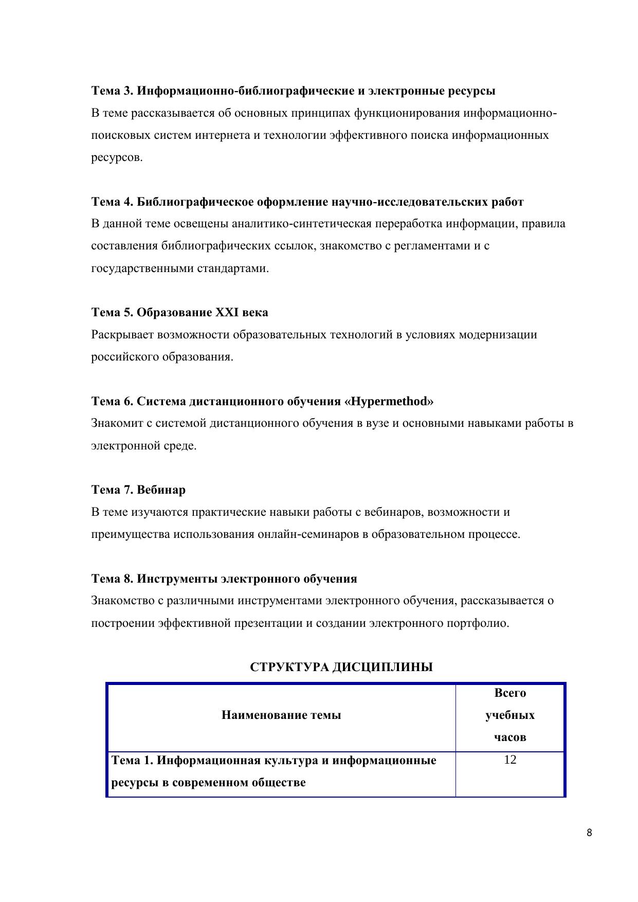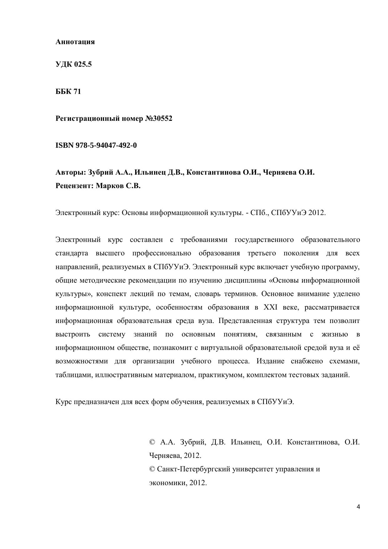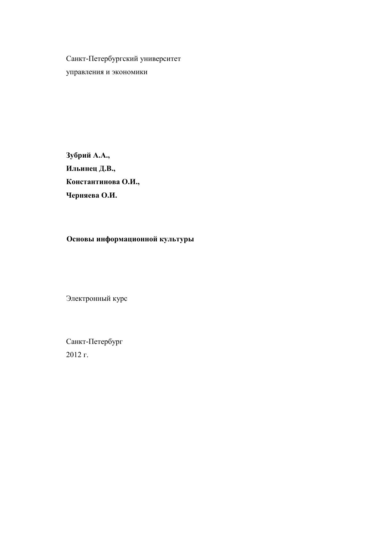 Электронный курс составлен с требованиями государственного образовательного стандарта высшего профессионально образования третьего поколения для всех направлений, реализуемых в СПбУУиЭ. Электронный курс включает учебную программу, общие методические рекомендации по изучению дисциплины «Основы информационной культуры», конспект лекций по темам, словарь терминов. Основное внимание уделено информационной культуре, особенностям образования в XXI веке, рассматривается информационная образовательная среда вуза. Представленная структура тем позволит выстроить систему знаний по основным понятиям, связанным с жизнью в информационном обществе, познакомит с виртуальной образовательной средой вуза и её возможностями для организации учебного процесса. Издание снабжено схемами, таблицами, иллюстративным материалом, практикумом, комплектом тестовых заданий. Курс предназначен для всех форм обучения, реализуемых в СПбУУиЭ.