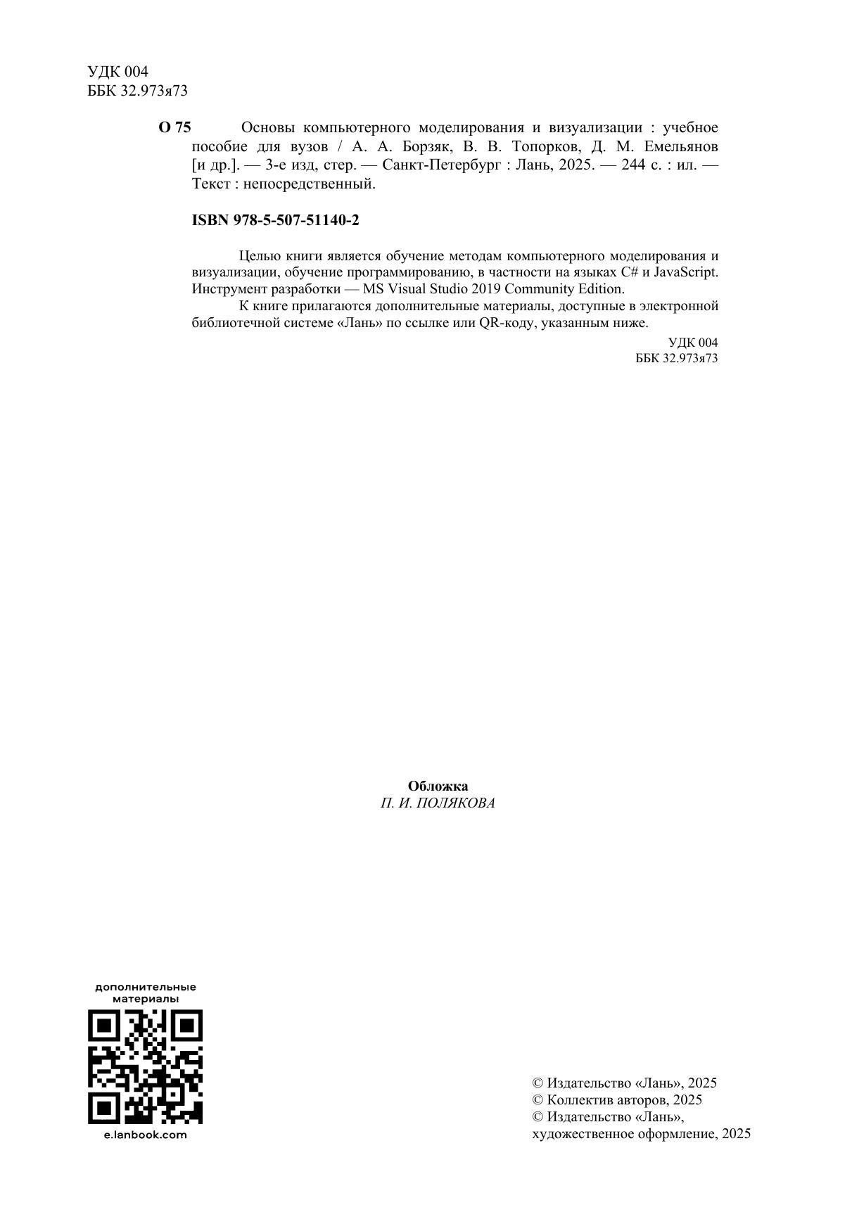 Целью книги является обучение методам компьютерного моделирования и визуализации, обучение программированию, в частности на языках C# и JavaScript. Инструмент разработки — MS Visual Studio 2019 Community Edition. К книге прилагаются дополнительные материалы, доступные в электронной библиотечной системе «Лань» по ссылке или QR-коду, указанным ниже.