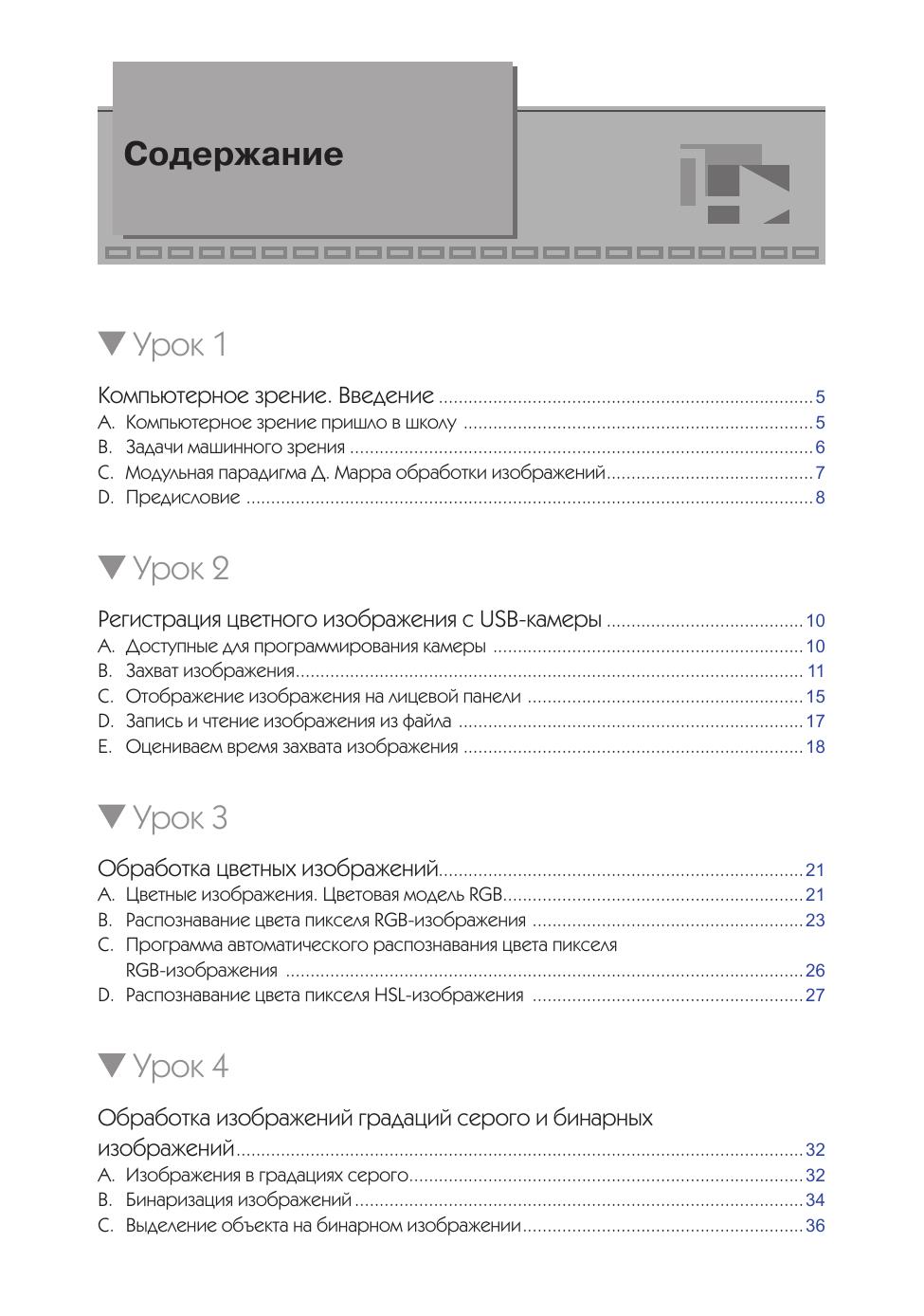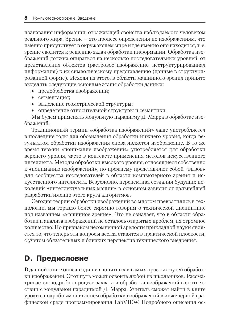 Данная книга представляет собой краткий учебный курс для школьников и студентов по машинному зрению и цифровой обработки изображений в среде визуального программирования LabVIEW с использованием библиотеки IMAQ Vision. Рассматриваются основные аспекты получения, хранения, обработки и анализа цифровых изображений, а также автоматического выделения и распознавания на изображениях различного рода объектов. Приводятся многочисленные примеры практических приложений машинного и компьютерного зрения в таких областях, как автоматизация измерений и технический контроль, видеонаблюдение, биометрия, обработка документов, медицинские приложения.
