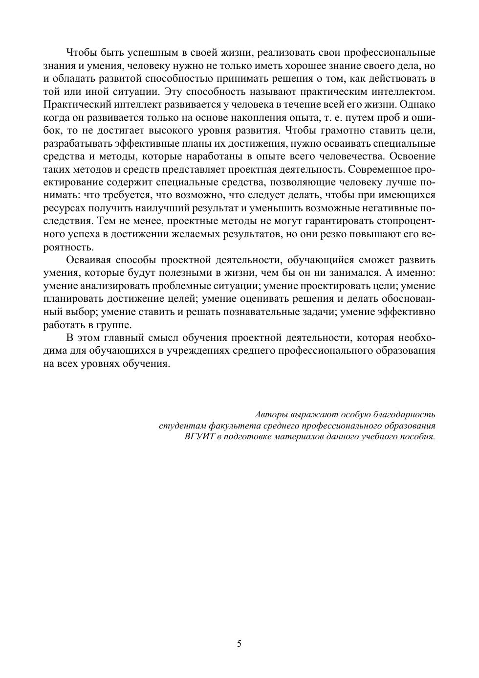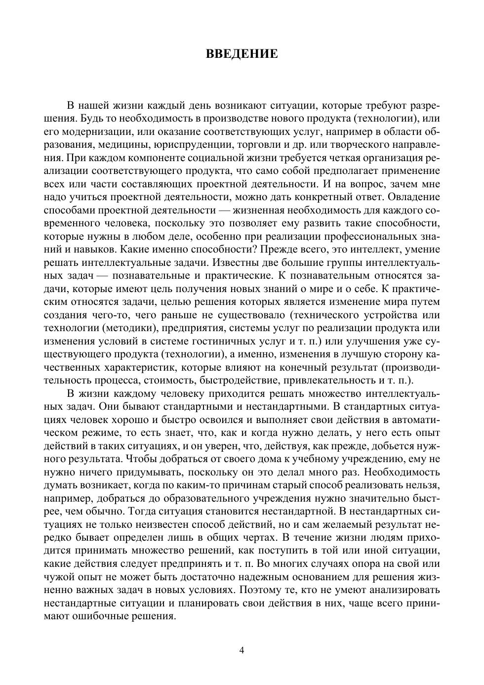 Для того чтобы грамотно и профессионально ставить цели, разрабатывать эффективные планы их достижения, нужно осваивать специальные средства и методы, которые применимы для решения практических проблем. Современное проектирование содержит специаль-ные средства, позволяющие человеку лучше понимать: что требуется, что возможно, что следует делать, чтобы при имеющихся ресурсах получить наилучший результат и уменьшить возможные негативные последствия. В отличие от традиционных учебников, это пособие предполагает освоение его содержания в активной деятельности учащихся по разработке проек-тов в соответствии с их типологией