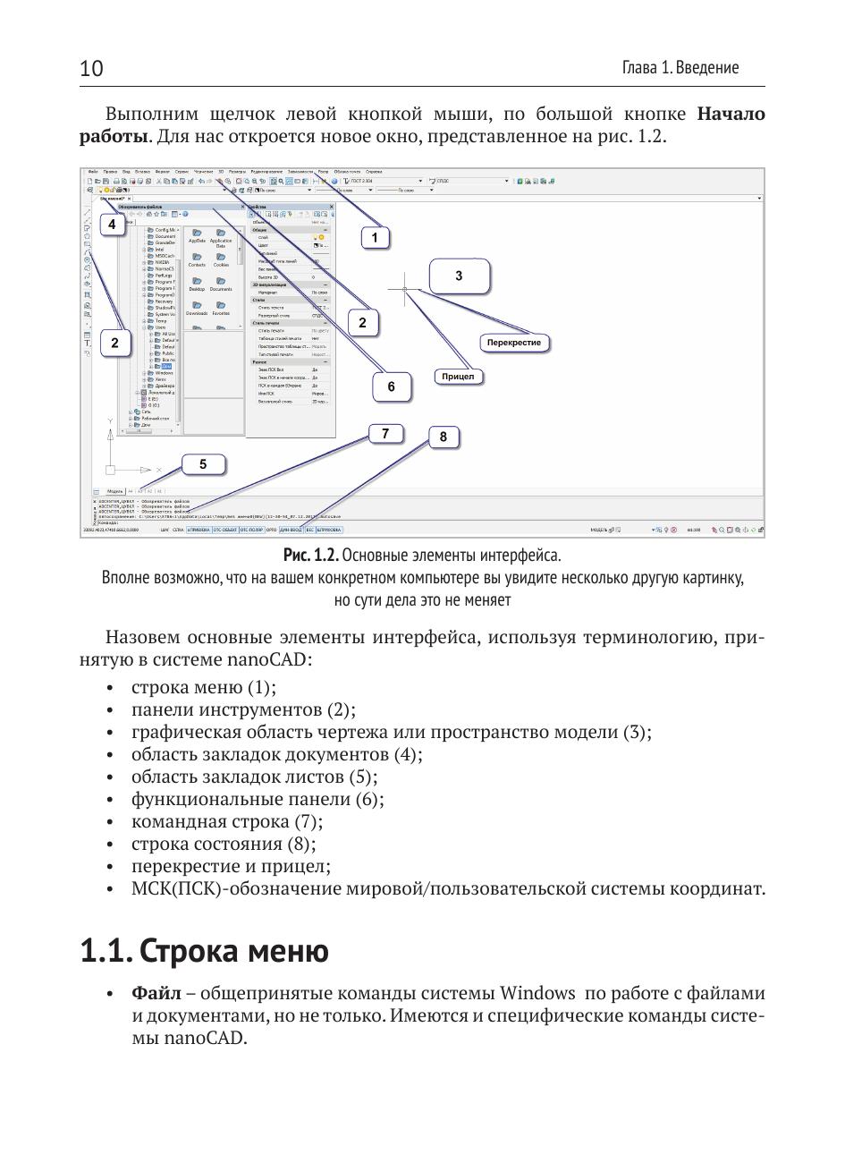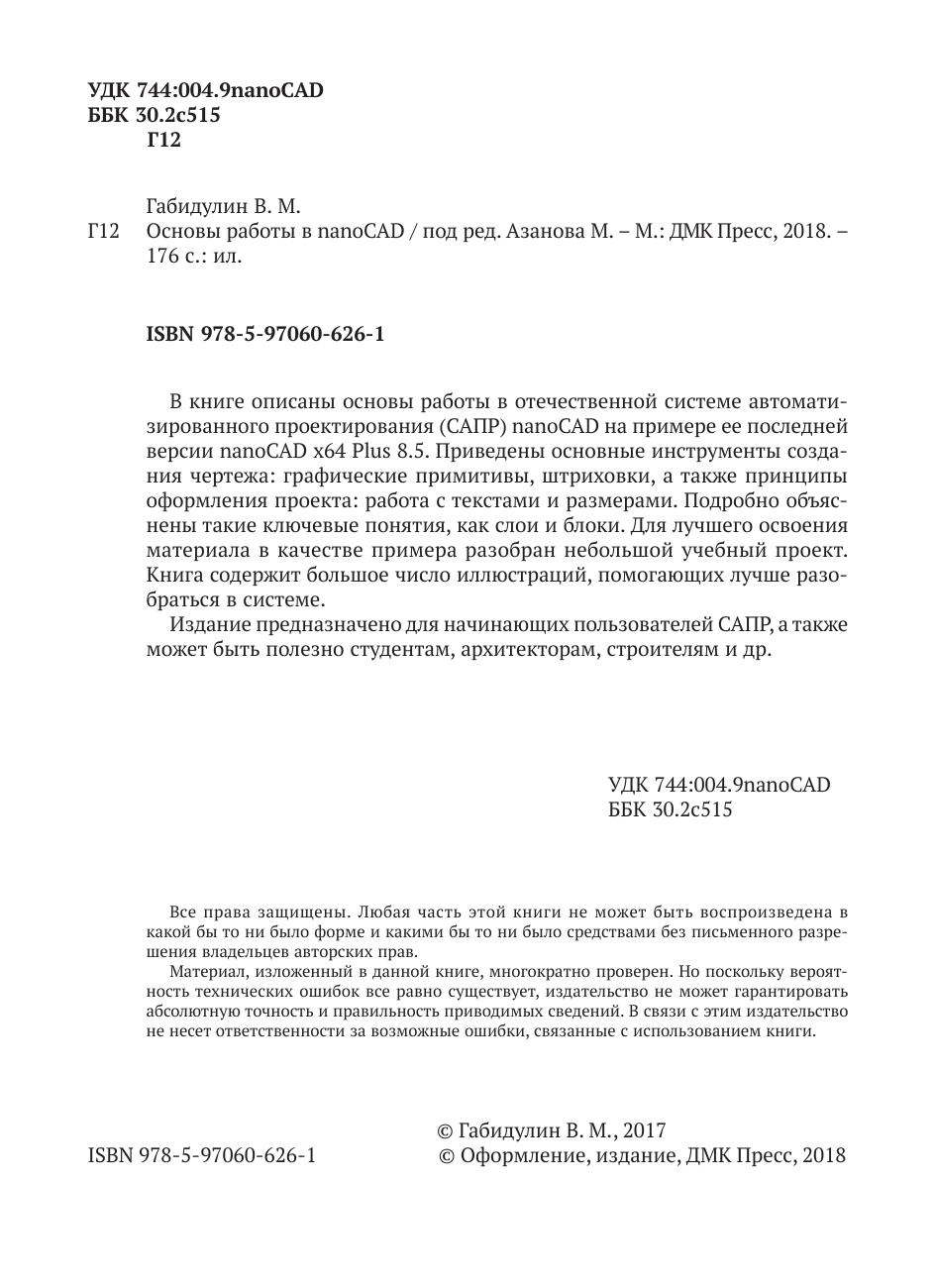 В книге описаны основы работы в отечественной системе автоматизированного проектирования (САПР) nanoCAD на примере ее последней версии nanoCAD x64 Plus 8.5. Приведены основные инструменты создания чертежа: графические примитивы, штриховки, а также принципы оформления проекта: работа с текстами и размерами. Подробно объяснены такие ключевые понятия, как слои и блоки. Для лучшего освоения материала в качестве примера разобран небольшой учебный проект.
