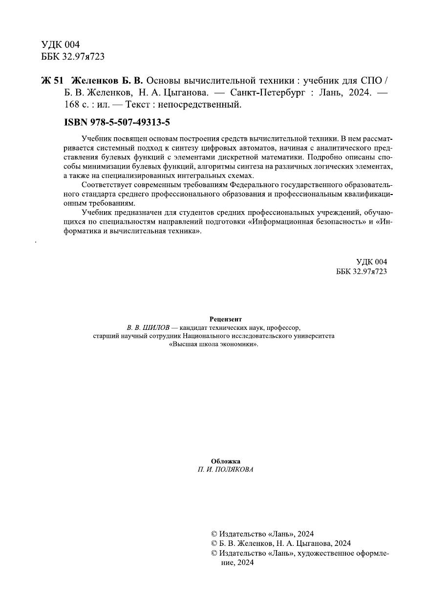 Учебник посвящен основам построения средств вычислительной техники. В нем рассматривается системный подход к синтезу цифровых автоматов, начиная с аналитического представления булевых функций с элементами дискретной математики. Подробно описаны способы минимизации булевых функций, алгоритмы синтеза на различных логических элементах, а также на специализированных интегральных схемах. Соответствует современным требованиям Федерального государственного образовательного стандарта среднего профессионального образования и профессиональным квалификационным требованиям. Учебник предназначен для студентов средних профессиональных учреждений, обучающихся по специальностям направлений подготовки «Информационная безопасность» и «Информатика и вычислительная техника».