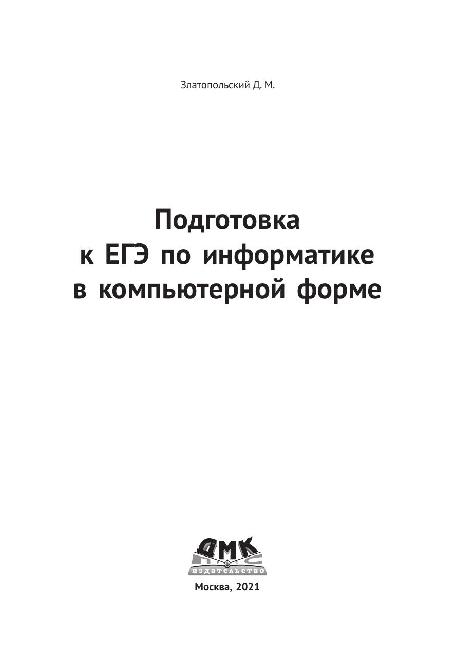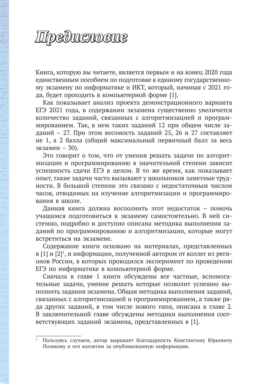 Книга предназначена для самостоятельной подготовки учащихся к единому государственному экзамену по информатике и ИКТ, который начиная с 2021 года будет проходить в компьютерной форме. Согласно демонстрационному варианту ЕГЭ 2021 года, в содержании экзамена будет существенно увеличено количество заданий, связанных с алгоритмизацией и программированием. Таким задачам в книге уделяется особое внимание. Обсуждаются и методики выполнения других заданий, представленных в демонстрационном варианте.