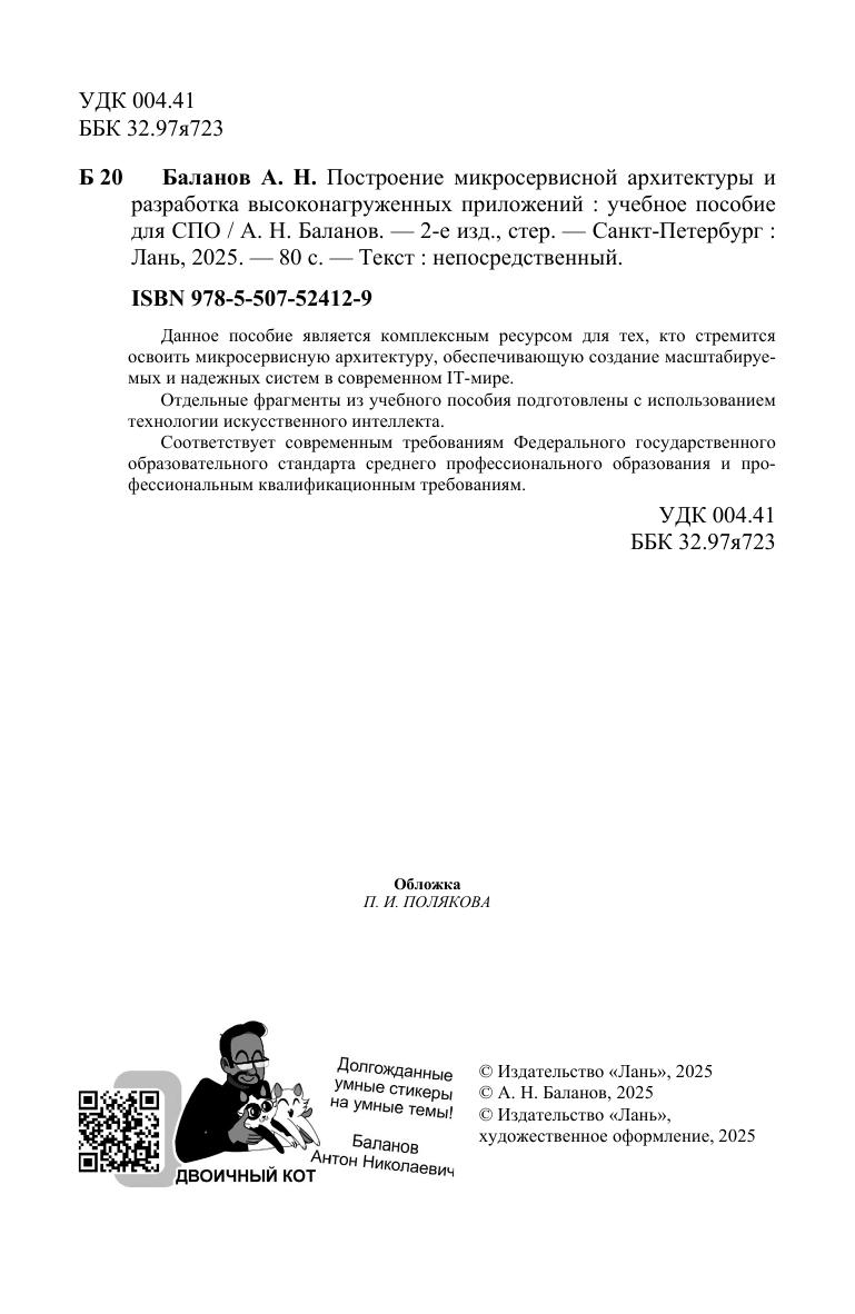 Данное пособие является комплексным ресурсом для тех, кто стремится освоить микросервисную архитектуру, обеспечивающую создание масштабируемых и надежных систем в современном IT-мире. Отдельные фрагменты из учебного пособия подготовлены с использованием технологии искусственного интеллекта. Соответствует современным требованиям Федерального государственного образовательного стандарта среднего профессионального образования и профессиональным квалификационным требованиям.