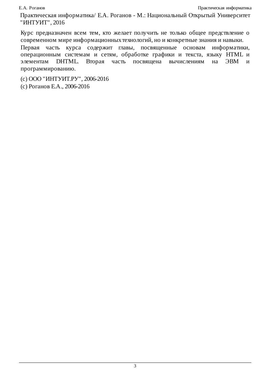 Курс предназначен всем тем, кто желает получить не только общее предствление о современном мире информационных технологий, но и конкретные знания и навыки. Первая часть курса содержит главы, посвященные основам информатики, операционным системам и сетям, обработке графики и текста, языку HTML и элементам DHTML. Вторая часть посвящена вычислениям на ЭВМ и программированию.