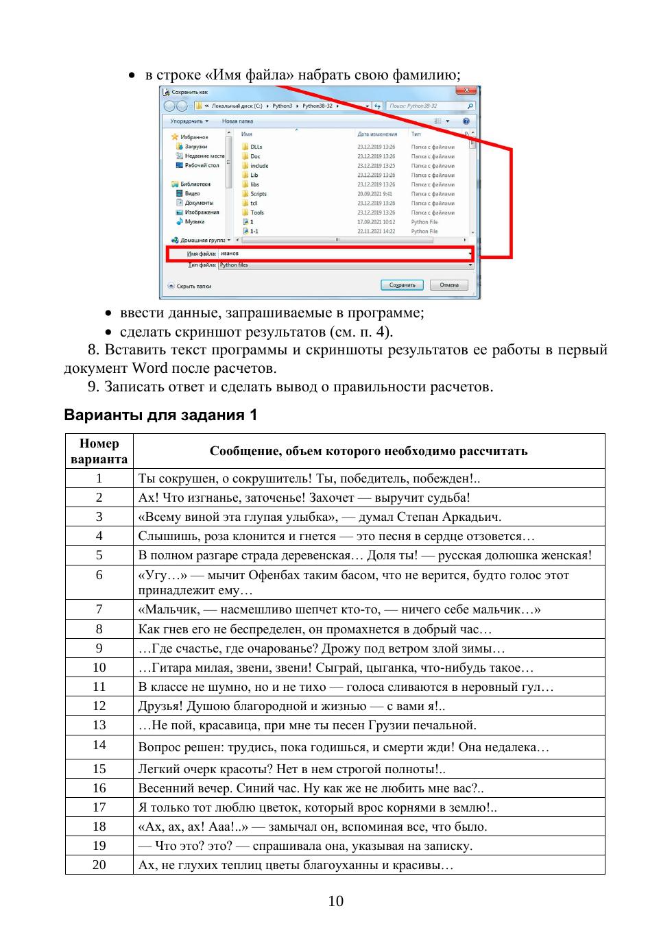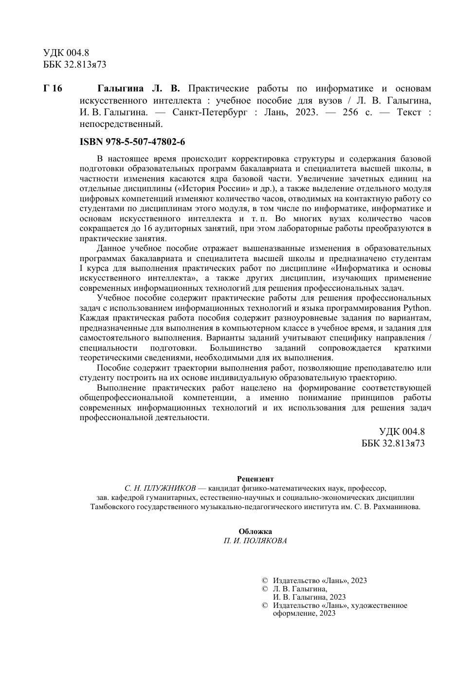 В настоящее время происходит корректировка структуры и содержания базовой подготовки образовательных программ бакалавриата и специалитета высшей школы, в частности изменения касаются ядра базовой части. Увеличение зачетных единиц на отдельные дисциплины («История России» и др.), а также выделение отдельного модуля цифровых компетенций изменяют количество часов, отводимых на контактную работу со студентами по дисциплинам этого модуля, в том числе по информатике, информатике и основам искусственного интеллекта и т. п. Во многих вузах количество часов сокращается до 16 аудиторных занятий, при этом лабораторные работы преобразуются в практические занятия. Данное учебное пособие отражает вышеназванные изменения в образовательных программах бакалавриата и специалитета высшей школы и предназначено студентам I курса для выполнения практических работ по дисциплине «Информатика и основы искусственного интеллекта», а также других дисциплин, изучающих применение современных информационных технологий для решения профессиональных задач. Учебное пособие содержит практические работы для решения профессиональных задач с использованием информационных технологий и языка программирования Python. Каждая практическая работа пособия содержит разноуровневые задания по вариантам, предназначенные для выполнения в компьютерном классе в учебное время, и задания для самостоятельного выполнения. Варианты заданий учитывают специфику направления / специальности подготовки. Большинство заданий сопровождается краткими теоретическими сведениями, необходимыми для их выполнения. Пособие содержит траектории выполнения работ, позволяющие преподавателю или студенту построить на их основе индивидуальную образовательную траекторию. Выполнение практических работ нацелено на формирование соответствующей общепрофессиональной компетенции, а именно понимание принципов работы современных информационных технологий и их использования для решения задач профессиональной деятельности.