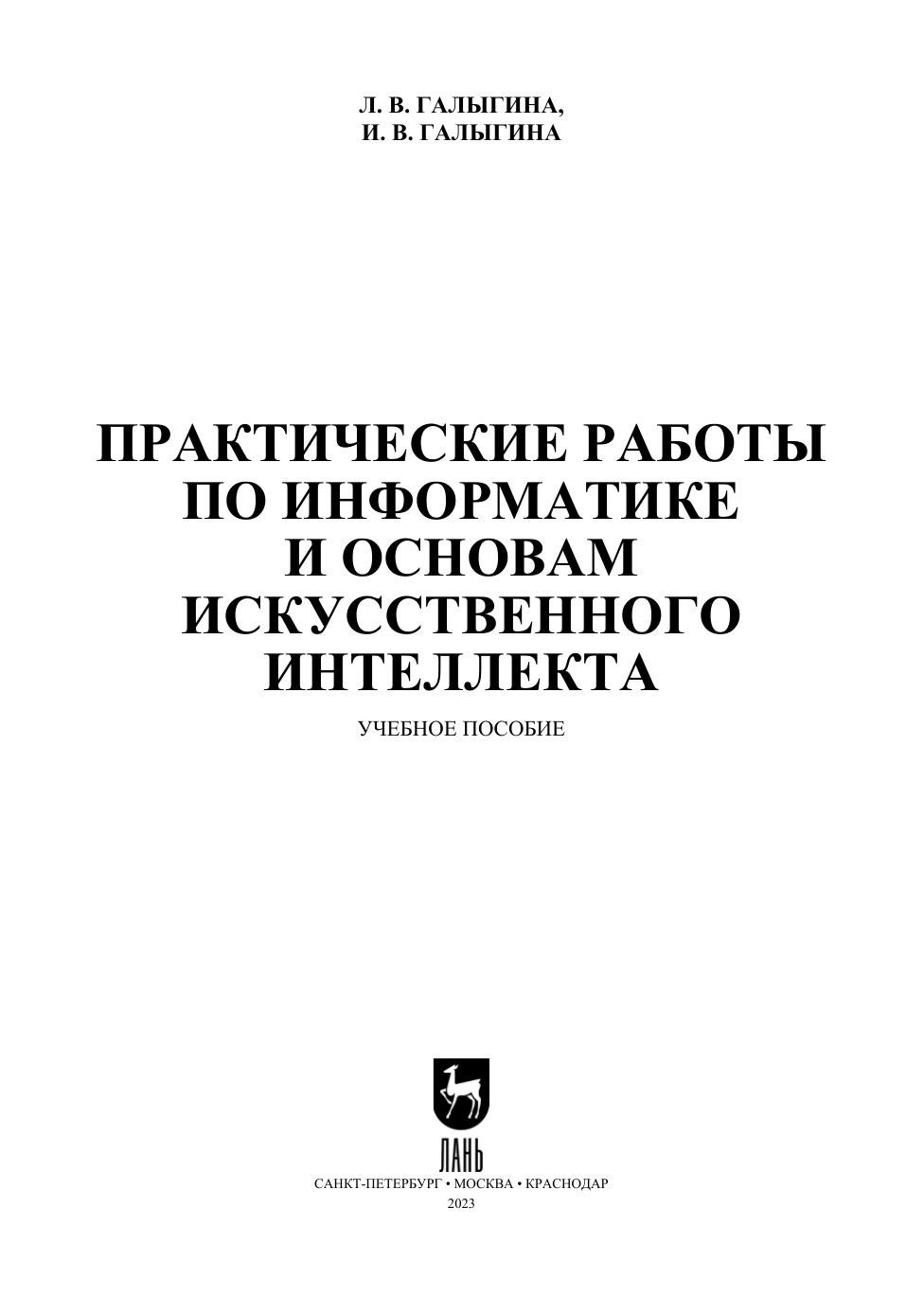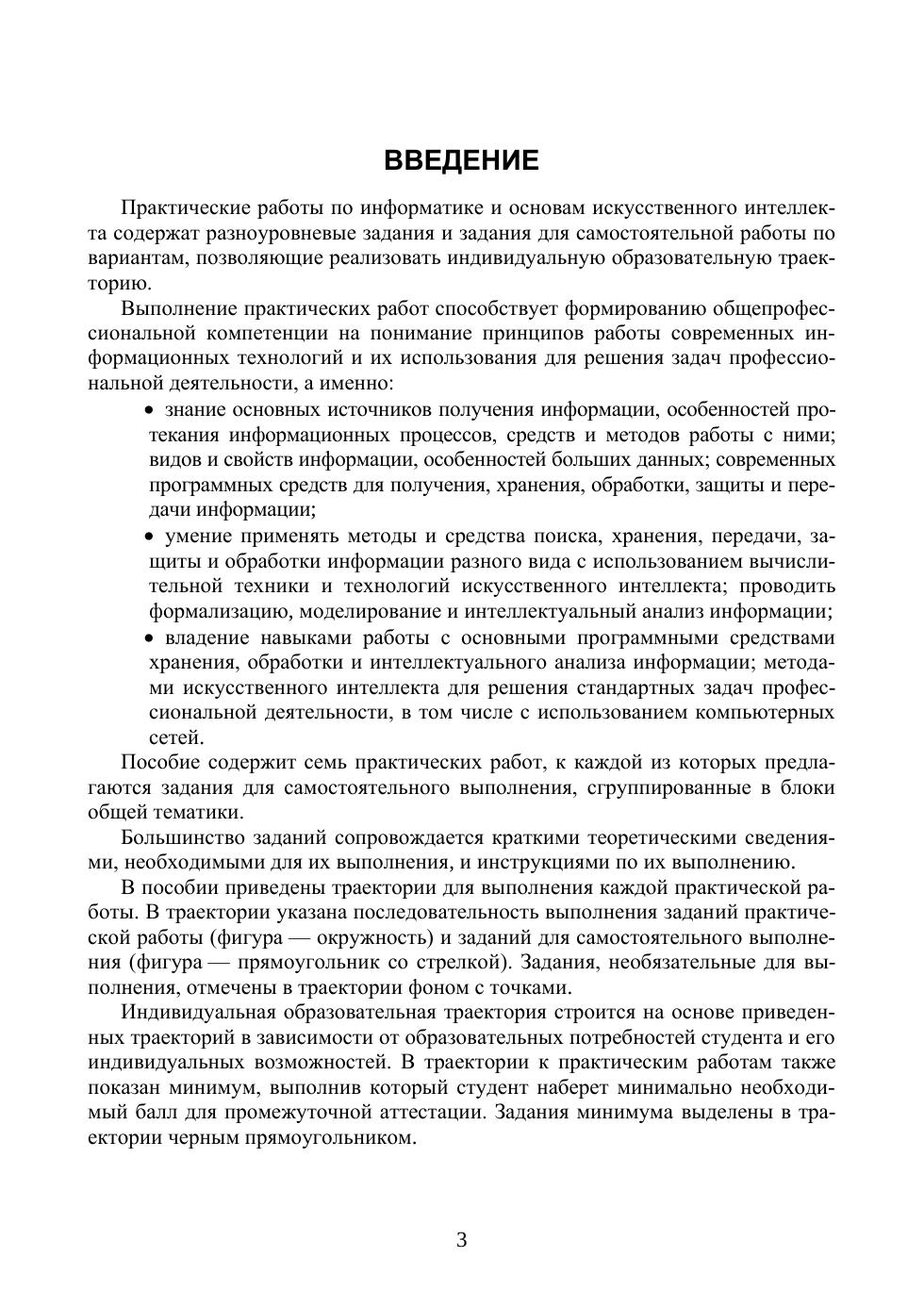 Пособие содержит практические работы с использованием информационно-коммуникационных, сетевых технологий и методов искусственного интеллекта для решения стандартных задач профессиональной деятельности на поиск, хранение, обработку и интеллектуальный анализ информации из различных источников и ее представление в требуемом формате, разноуровневые задания для самостоятельного выполнения, в частности, на языке программирования Python, позволяющие реализовать индивидуальную образовательную траекторию. Соответствует современным требованиям Федерального государственного образовательного стандарта среднего профессионального образования и профессиональным квалификационным требованиям. Пособие предназначено для обучающихся в колледжах по образовательным программам среднего профессионального образования для выполнения практических работ по дисциплине «Информатика и основы искусственного интеллекта».
