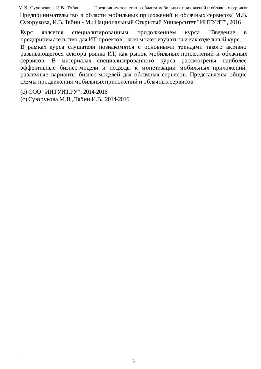 Курс является специализированным продолжением курса "Введение в предпринимательство для ИТ-проектов", хотя может изучаться и как отдельный курс. В рамках курса слушатели познакомятся с основными трендами такого активно развивающегося сектора рынка ИТ, как рынок мобильных приложений и облачных сервисов. В материалах специализированного курса рассмотрены наиболее эффективные бизнес-модели и подходы к монетизации мобильных приложений, различные варианты бизнес-моделей для облачных сервисов. Представлены общие схемы продвижения мобильных приложений и облачных сервисов.