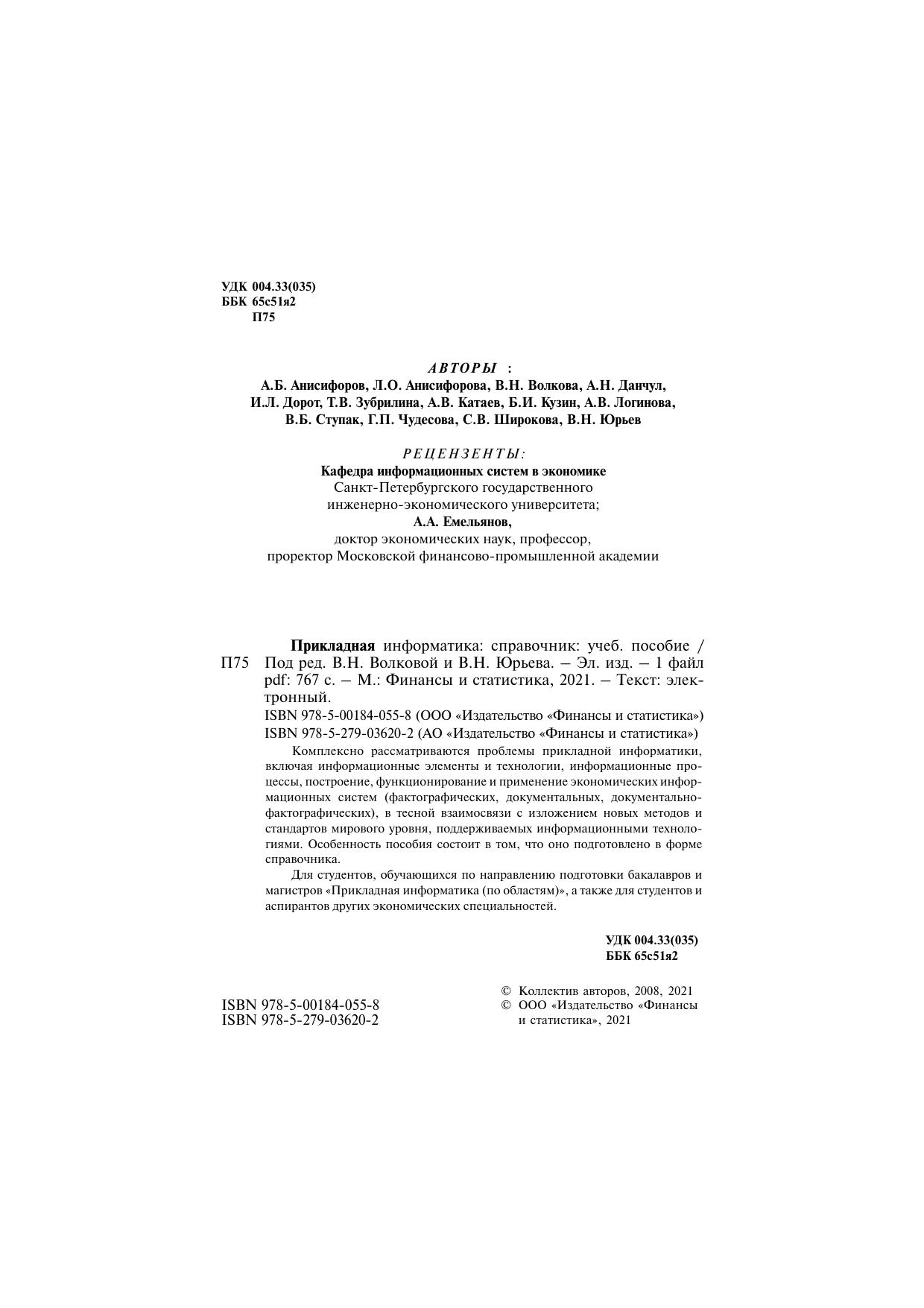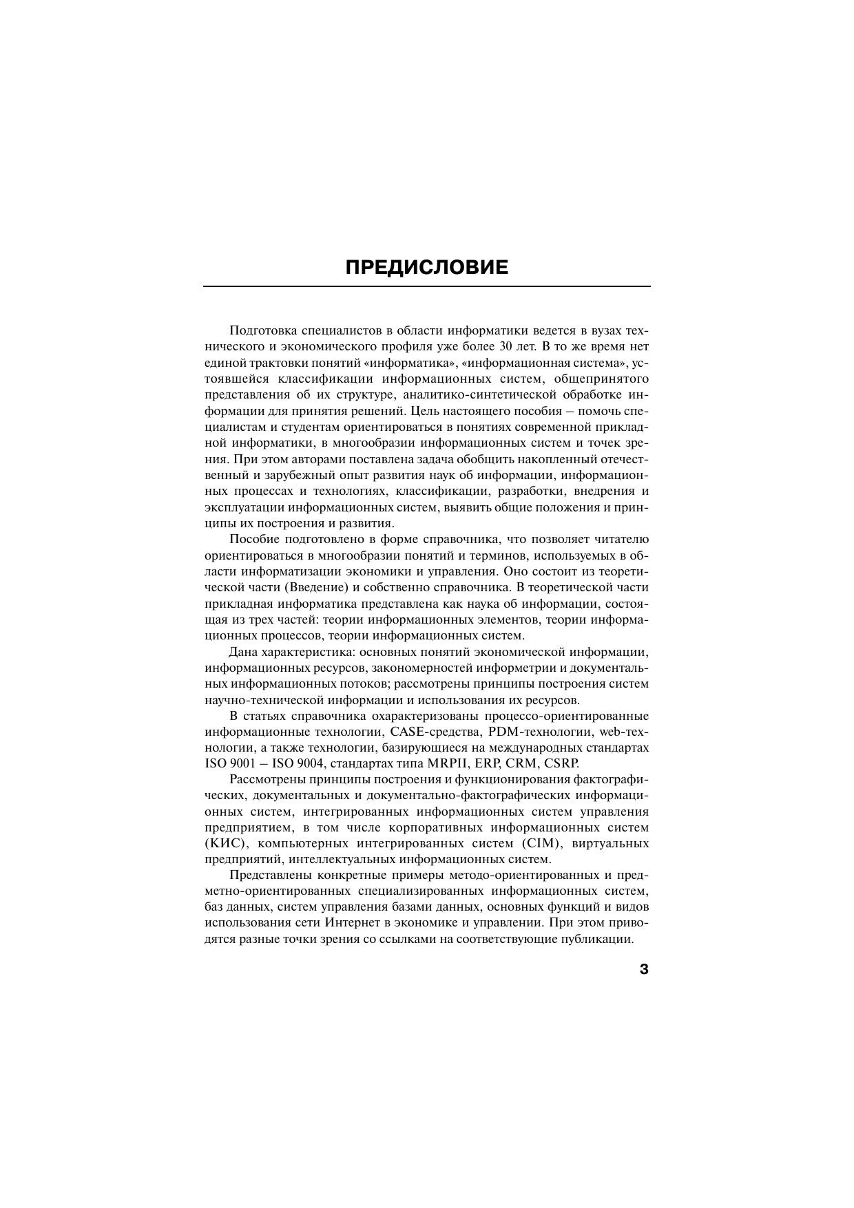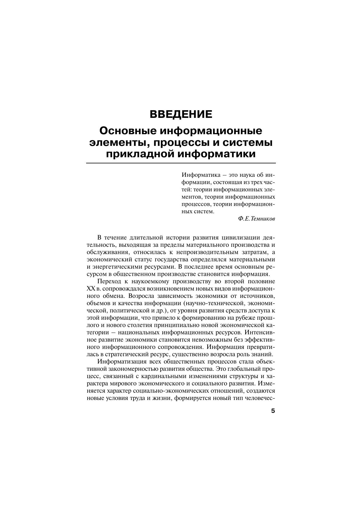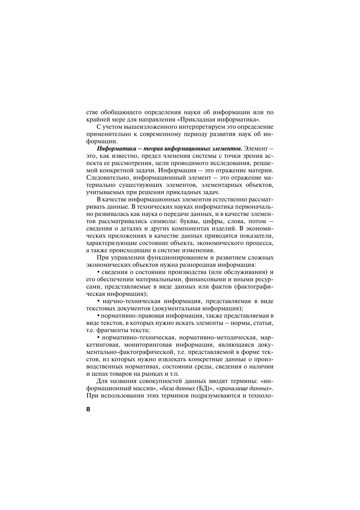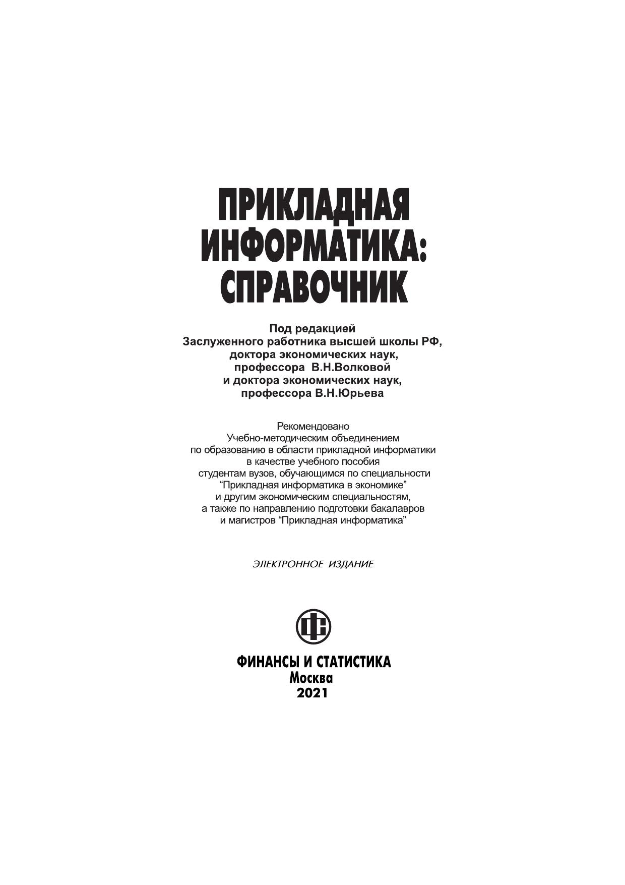 Комплексно рассматриваются проблемы прикладной информатики, включая информационные элементы и технологии, информационные процессы, построение, функционирование и применение экономических информационных систем (фактографических, документальных, документально-фактографических), в тесной взаимосвязи с изложением новых методов и стандартов мирового уровня, поддерживаемых информационными технологиями. Особенность пособия состоит в том, что оно подготовлено в форме справочника. Для студентов, обучающихся по направлению подготовки бакалавров и магистров «Прикладная информатика (по областям)», а также для студентов и аспирантов других экономических специальностей.