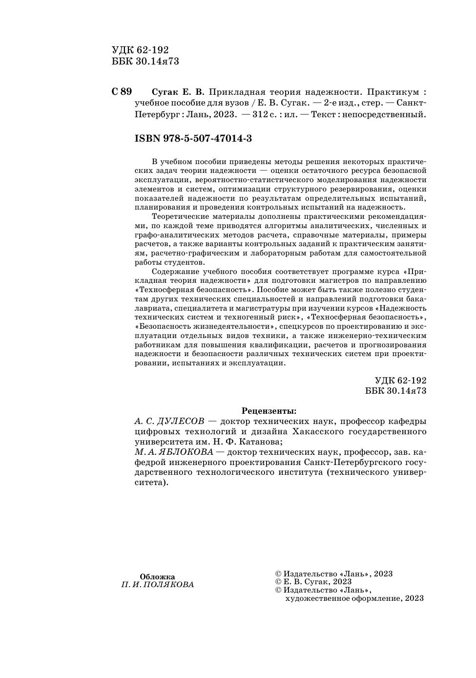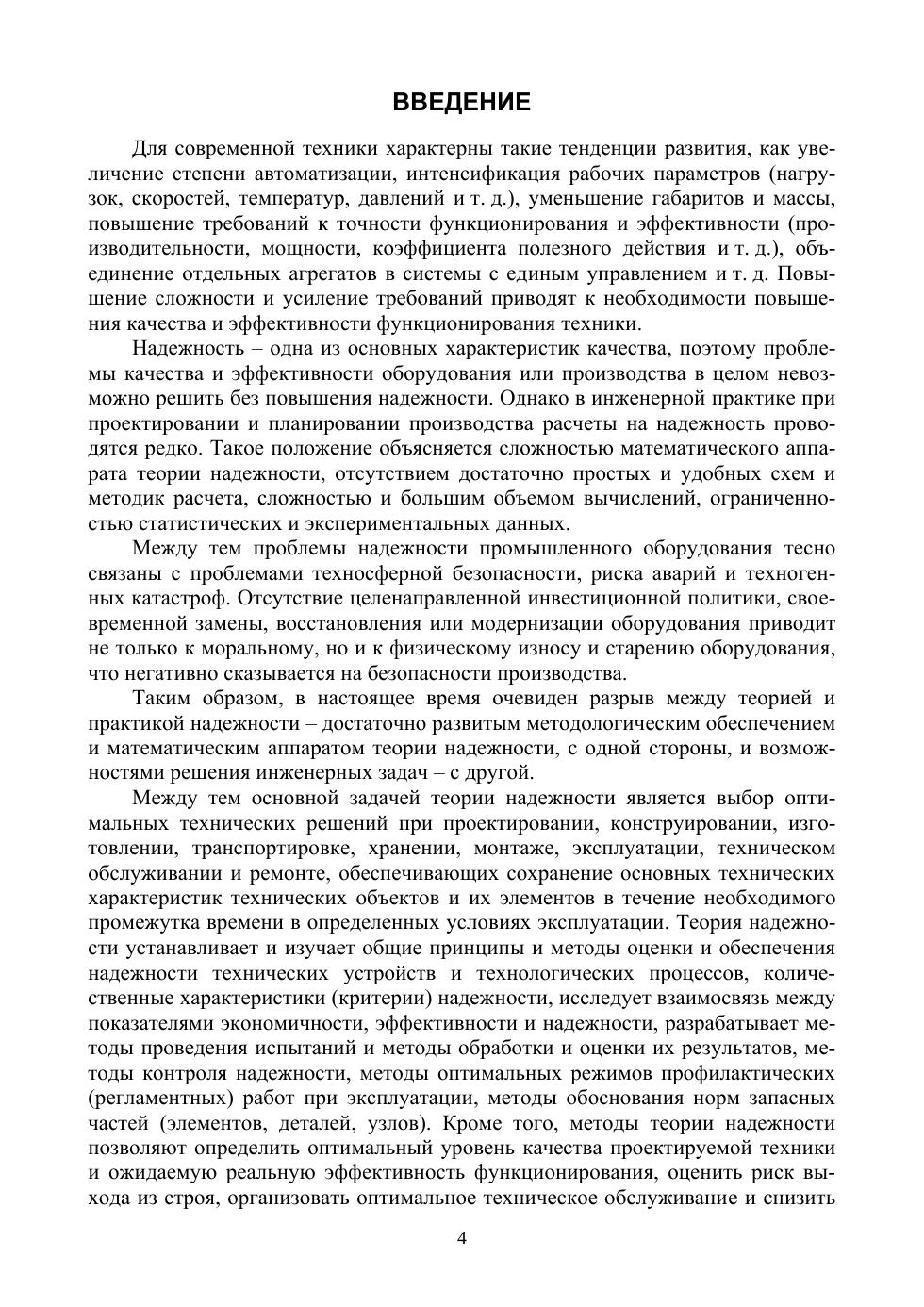В учебном пособии приведены методы решения некоторых практических задач теориии надежности — оценки остаточного ресурса безопасной эксплуатации, вероятностно-статистического моделирования надежности элементов и систем, оптимизации структурного резервирования, оценки показателей надежности по результатам определительных испытаний, планирования и проведения контрольных испытаний на надежность. Теоретические материалы дополнены практическими рекомендациями, по каждой теме приводятся алгоритмы аналитических, численных и графо-аналитических методов расчета, справочные материалы, примеры расчетов, а также варианты контрольных заданий к практическим занятиям, расчетно-графическим и лабораторным работам для самостоятельной работы студентов. Содержание учебного пособия соответствует программе курса «Прикладная теория надежности» для подготовки магистров по направлению «Техносферная безопасность». Пособие может быть также полезно студентам других технических специальностей и направлений подготовки бакалавриата, специалитета и магистратуры при изучении курсов «Надежность технических систем и техногенный риск», «Техносферная безопасность», «Безопасность жизнедеятельности», спецкурсов по проектированию и эксплуатации отдельных видов техники, а также инженерно-техническим работникам для повышения квалификации, расчетов и прогнозирования надежности и безопасности различных технических систем при проектировании, испытаниях и эксплуатации.