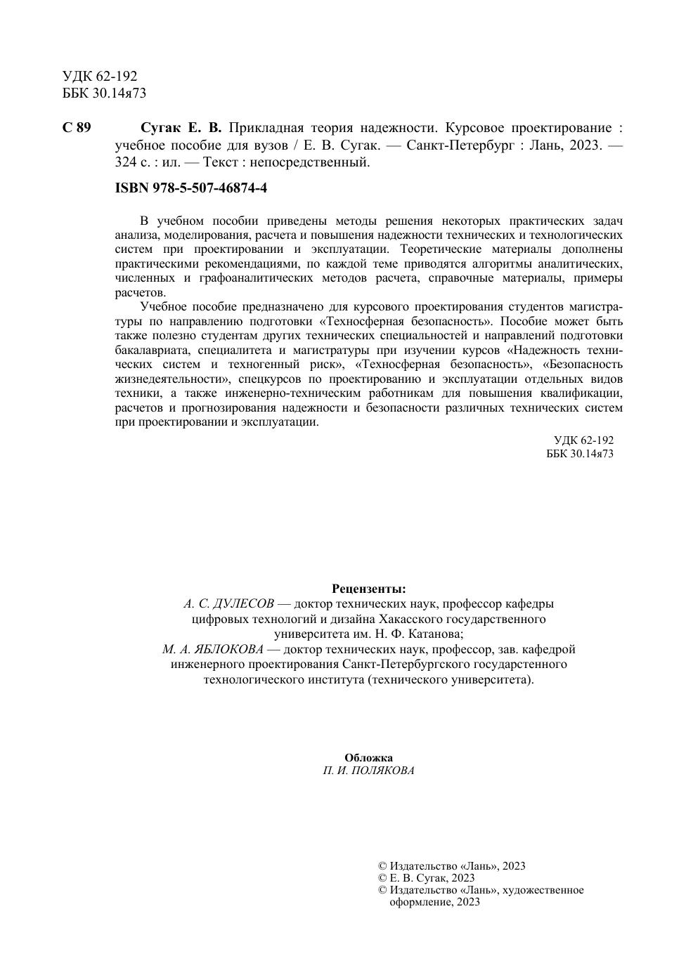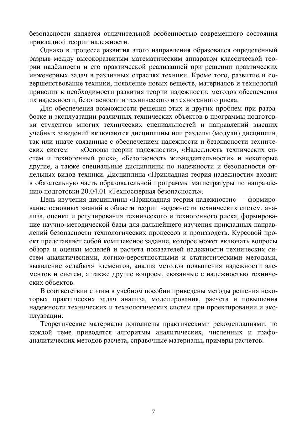 В учебном пособии приведены методы решения некоторых практических задач анализа, моделирования, расчета и повышения надежности технических и технологических систем при проектировании и эксплуатации. Теоретические материалы дополнены практическими рекомендациями, по каждой теме приводятся алгоритмы аналитических, численных и графоаналитических методов расчета, справочные материалы, примеры расчетов. Учебное пособие предназначено для курсового проектирования студентов магистратуры по направлению подготовки «Техносферная безопасность». Пособие может быть также полезно студентам других технических специальностей и направлений подготовки бакалавриата, специалитета и магистратуры при изучении курсов «Надежность технических систем и техногенный риск», «Техносферная безопасность», «Безопасность жизнедеятельности», спецкурсов по проектированию и эксплуатации отдельных видов техники, а также инженерно-техническим работникам для повышения квалификации, расчетов и прогнозирования надежности и безопасности различных технических систем при проектировании и эксплуатации.