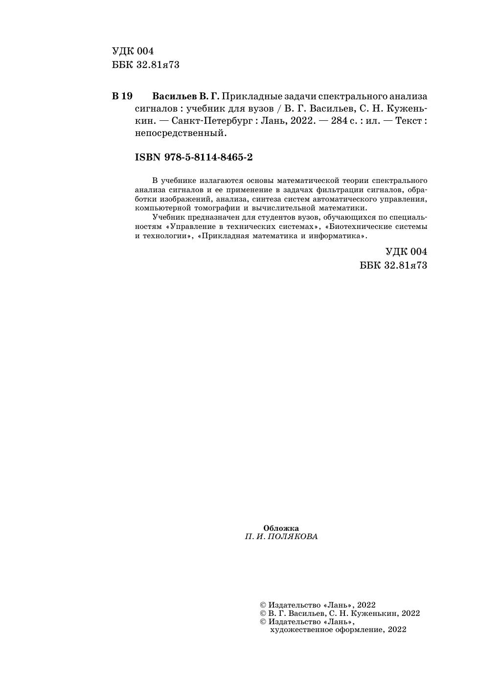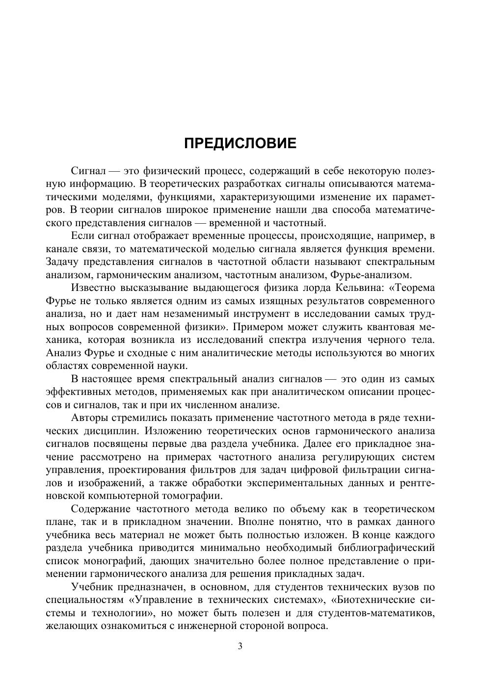 В учебнике излагаются основы математической теории спектрального анализа сигналов и ее применение в задачах фильтрации сигналов, обработки изображений, анализа, синтеза систем автоматического управления, компьютерной томографии и вычислительной математики. Учебник предназначен для студентов вузов, обучающихся по специальностям «Управление в технических системах», «Биотехнические системы и технологии», «Прикладная математика и информатика».