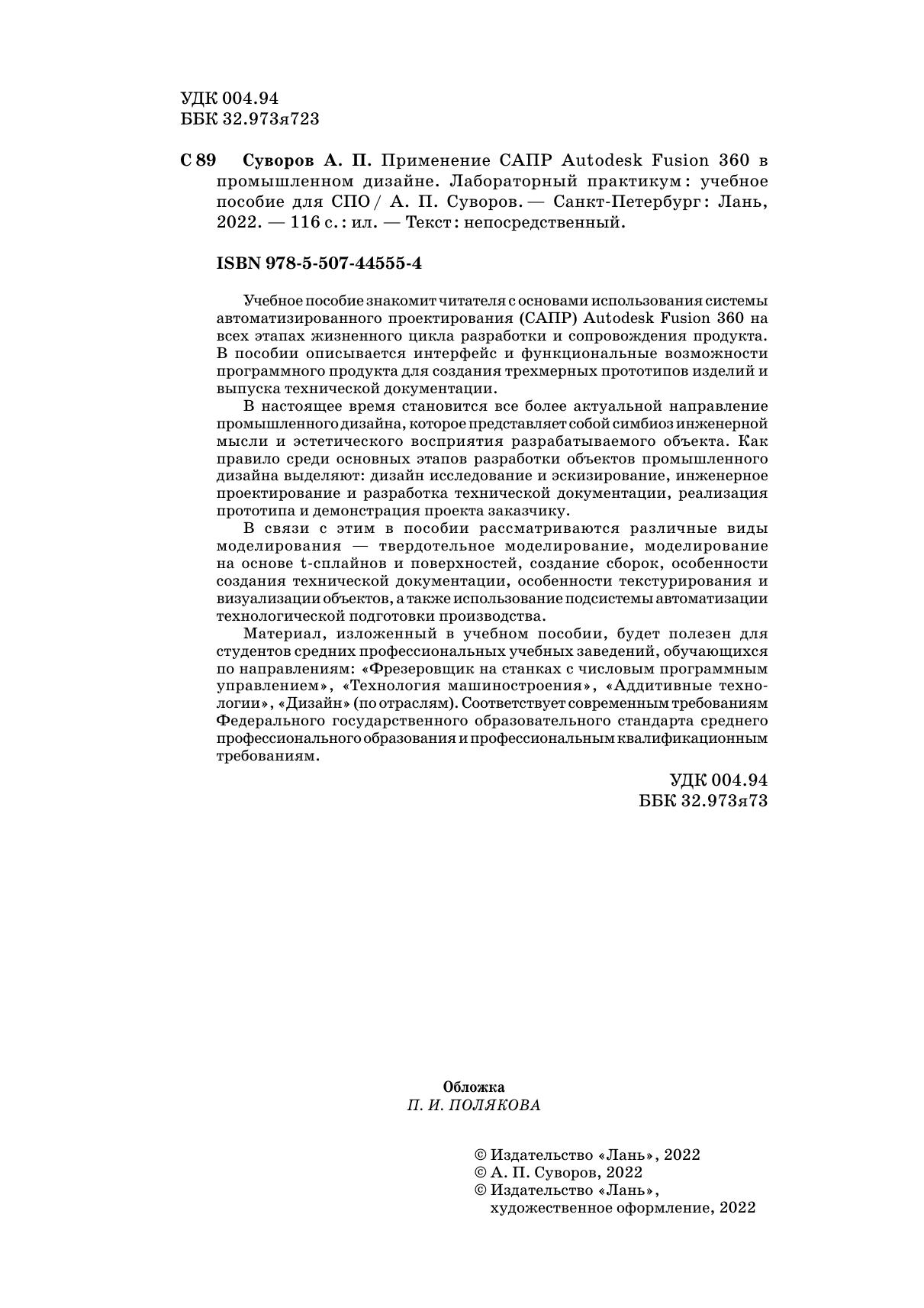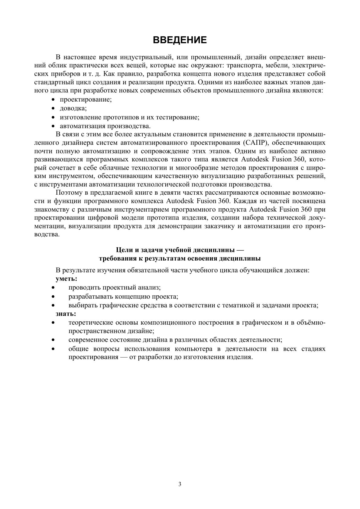 Учебное пособие знакомит читателя с основами использования системы автоматизированного проектирования (САПР) Autodesk Fusion 360 на всех этапах жизненного цикла разработки и сопровождения продукта. В пособии описывается интерфейс и функциональные возможности программного продукта для создания трехмерных прототипов изделий и выпуска технической документации. В настоящее время становится все более актуальной направление промышленного дизайна, которое представляет собой симбиоз инженерной мысли и эстетического восприятия разрабатываемого объекта. Как правило среди основных этапов разработки объектов промышленного дизайна выделяют: дизайн исследование и эскизирование, инженерное проектирование и разработка технической документации, реализация прототипа и демонстрация проекта заказчику. В связи с этим в пособии рассматриваются различные виды моделирования — твердотельное моделирование, моделирование на основе t-сплайнов и поверхностей, создание сборок, особенности создания технической документации, особенности текстурирования и визуализации объектов, а также использование подсистемы автоматизации технологической подготовки производства. Материал, изложенный в учебном пособии, будет полезен для студентов средних профессиональных учебных заведений, обучающихся по направлениям: «Фрезеровщик на станках с числовым программным управлением», «Технология машиностроения», «Аддитивные технологии», «Дизайн» (по отраслям). Соответствует современным требованиям Федерального государственного образовательного стандарта среднего профессионального образования и профессиональным квалификационным требованиям.