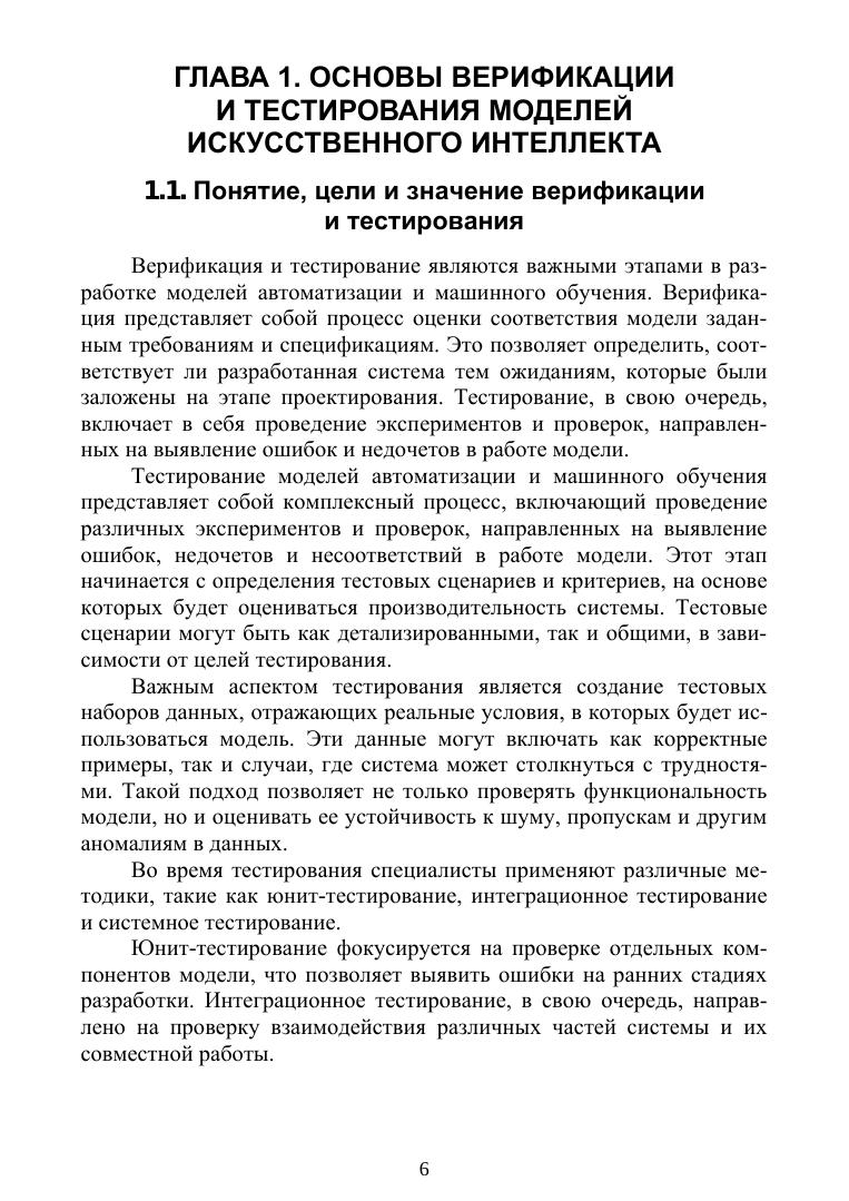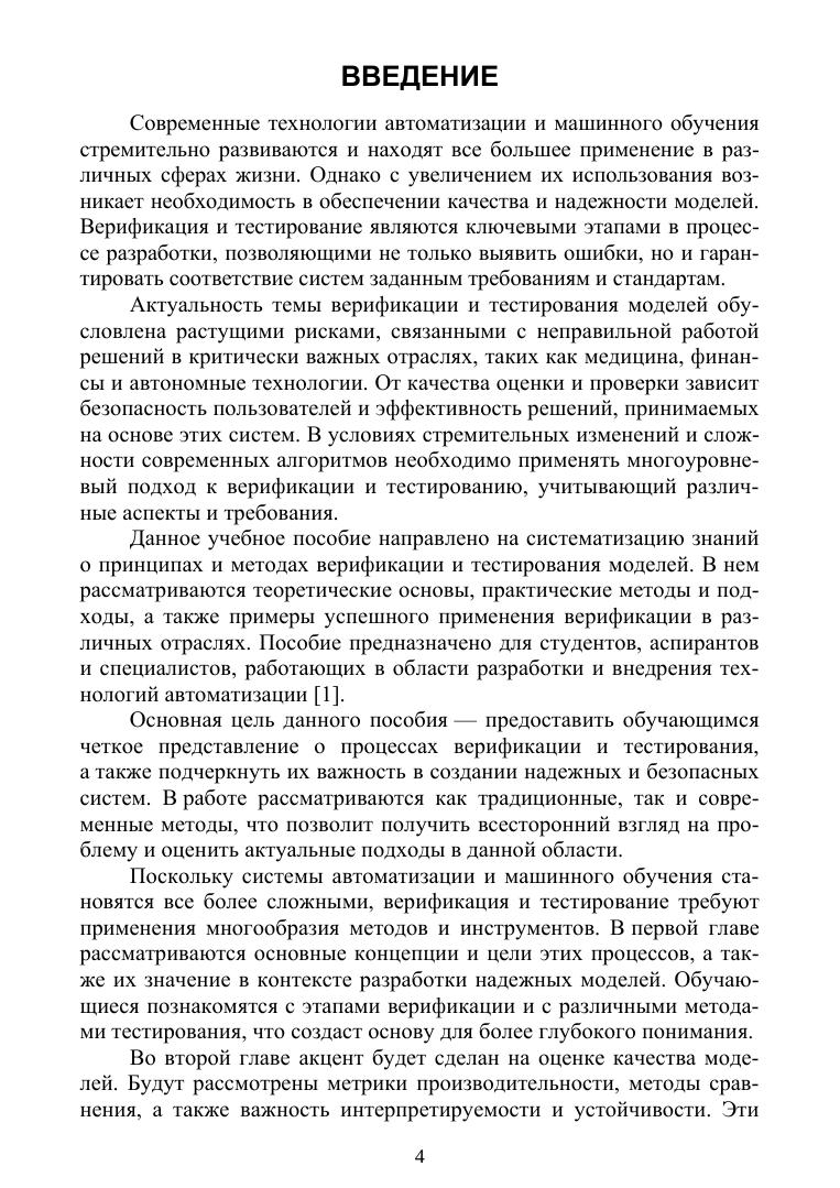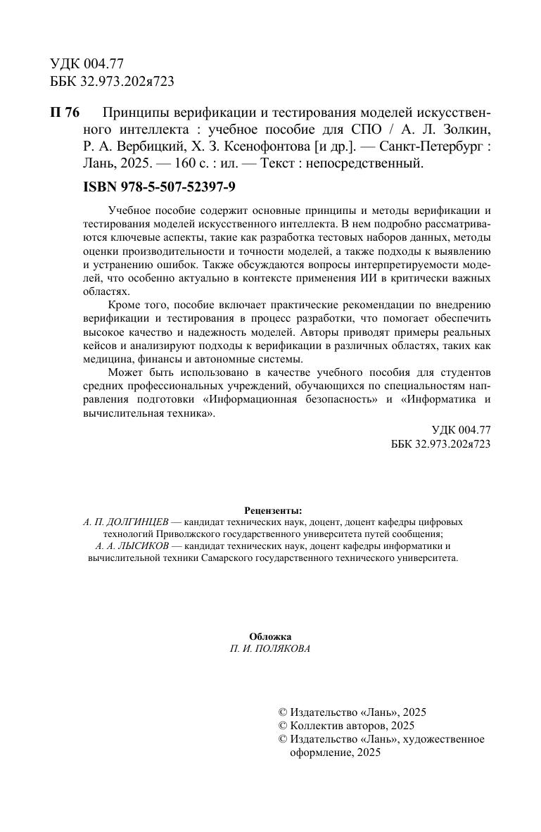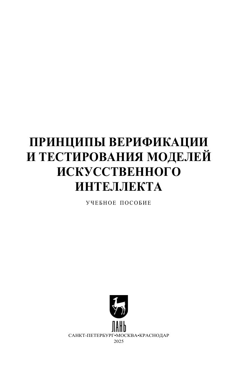 Учебное пособие содержит основные принципы и методы верификации и тестирования моделей искусственного интеллекта. В нем подробно рассматриваются ключевые аспекты, такие как разработка тестовых наборов данных, методы оценки производительности и точности моделей, а также подходы к выявлению и устранению ошибок. Также обсуждаются вопросы интерпретируемости моделей, что особенно актуально в контексте применения ИИ в критически важных областях. Кроме того, пособие включает практические рекомендации по внедрению верификации и тестирования в процесс разработки, что помогает обеспечить высокое качество и надежность моделей. Авторы приводят примеры реальных кейсов и анализируют подходы к верификации в различных областях, таких как медицина, финансы и автономные системы. Может быть использовано в качестве учебного пособия для студентов средних профессиональных учреждений, обучающихся по специальностям направления подготовки «Информационная безопасность» и «Информатика и вычислительная техника».