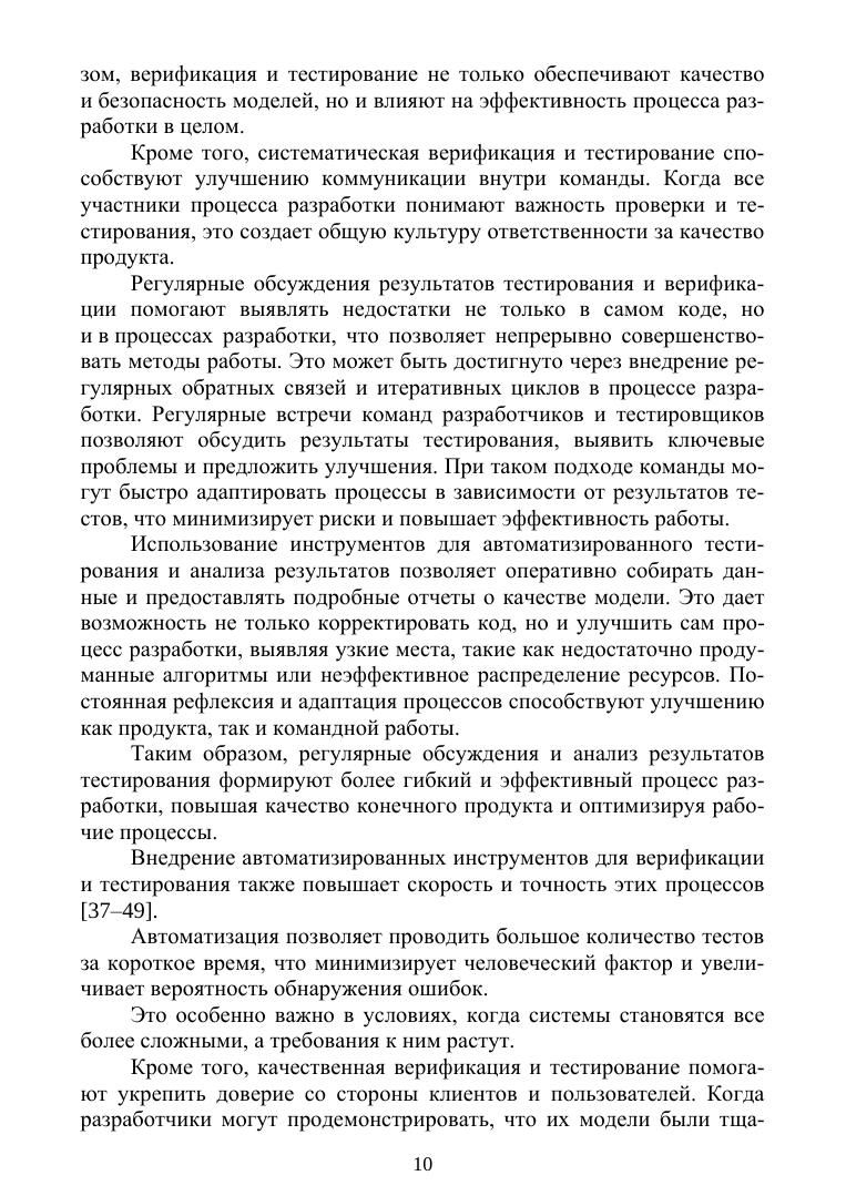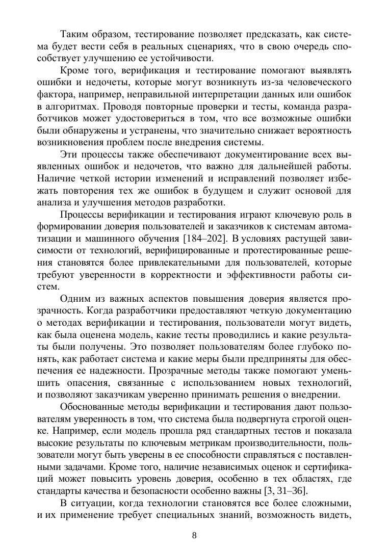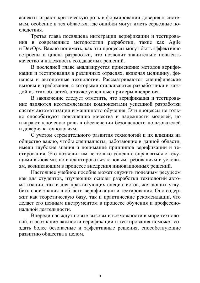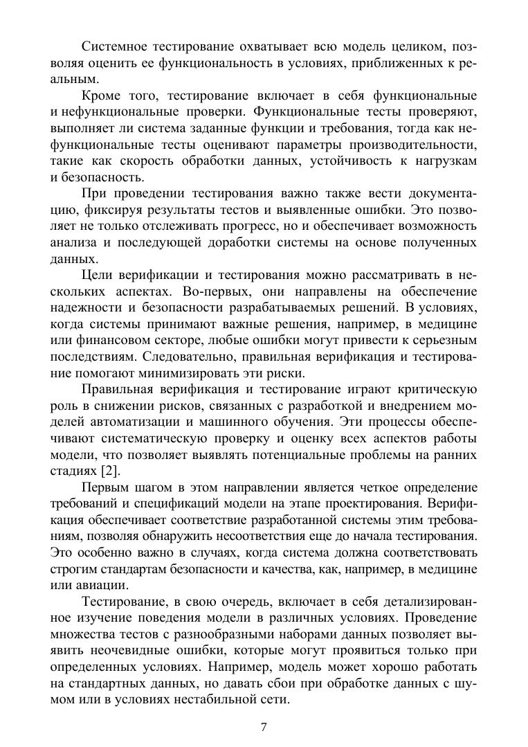 Учебное пособие содержит основные принципы и методы верификации и тестирования моделей искусственного интеллекта. В нем подробно рассматриваются ключевые аспекты, такие как разработка тестовых наборов данных, методы оценки производительности и точности моделей, а также подходы к выявлению и устранению ошибок. Также обсуждаются вопросы интерпретируемости моделей, что особенно актуально в контексте применения ИИ в критически важных областях. Кроме того, пособие включает практические рекомендации по внедрению верификации и тестирования в процесс разработки, что помогает обеспечить высокое качество и надежность моделей. Авторы приводят примеры реальных кейсов и анализируют подходы к верификации в различных областях, таких как медицина, финансы и автономные системы. Может быть использовано в качестве учебного пособия для студентов средних профессиональных учреждений, обучающихся по специальностям направления подготовки «Информационная безопасность» и «Информатика и вычислительная техника».